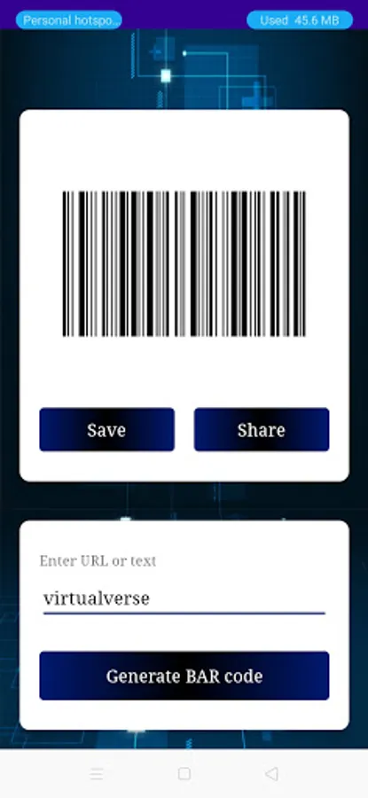 Type your text or link and create Bar code or QR code and save it as image or share.