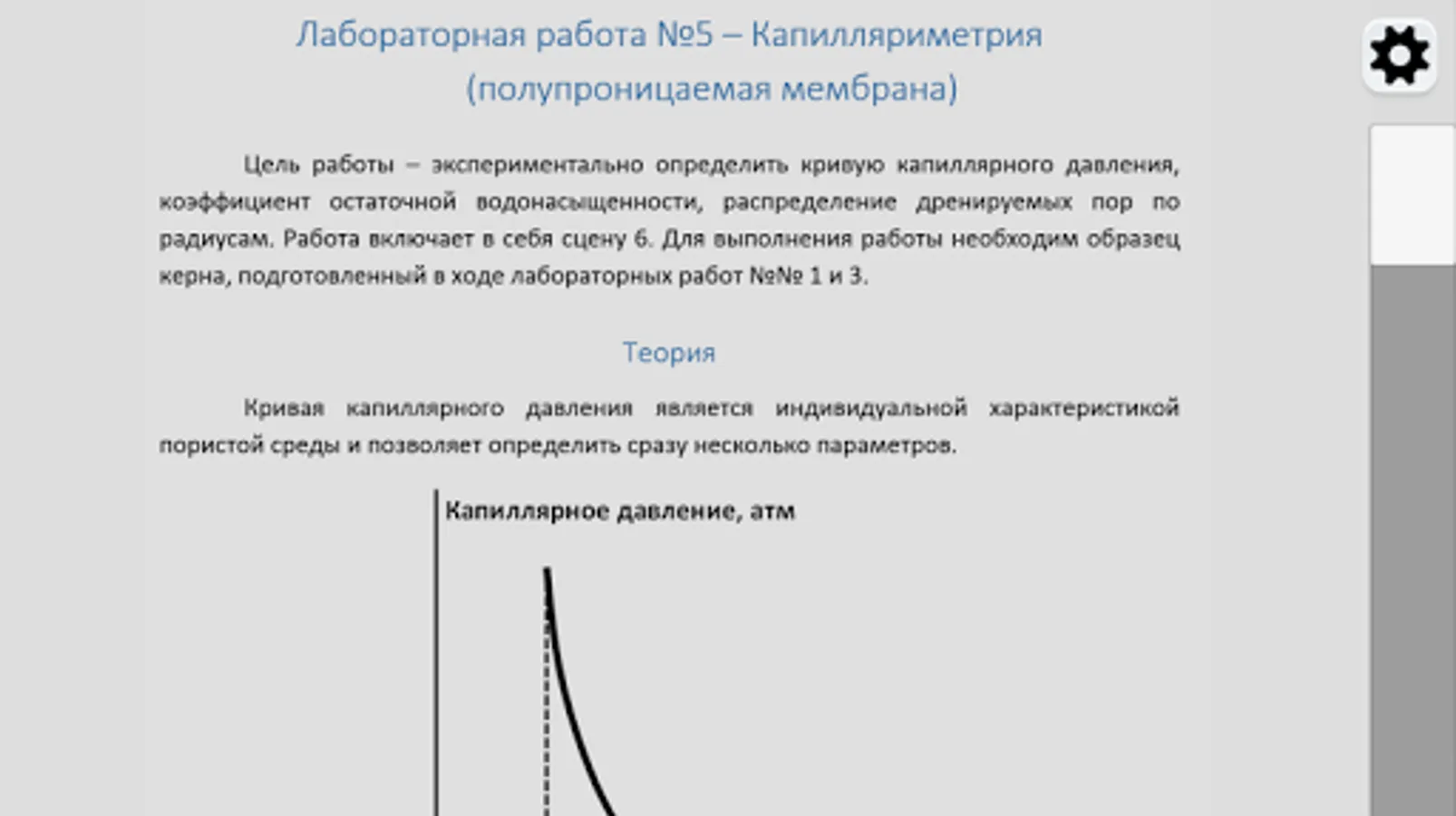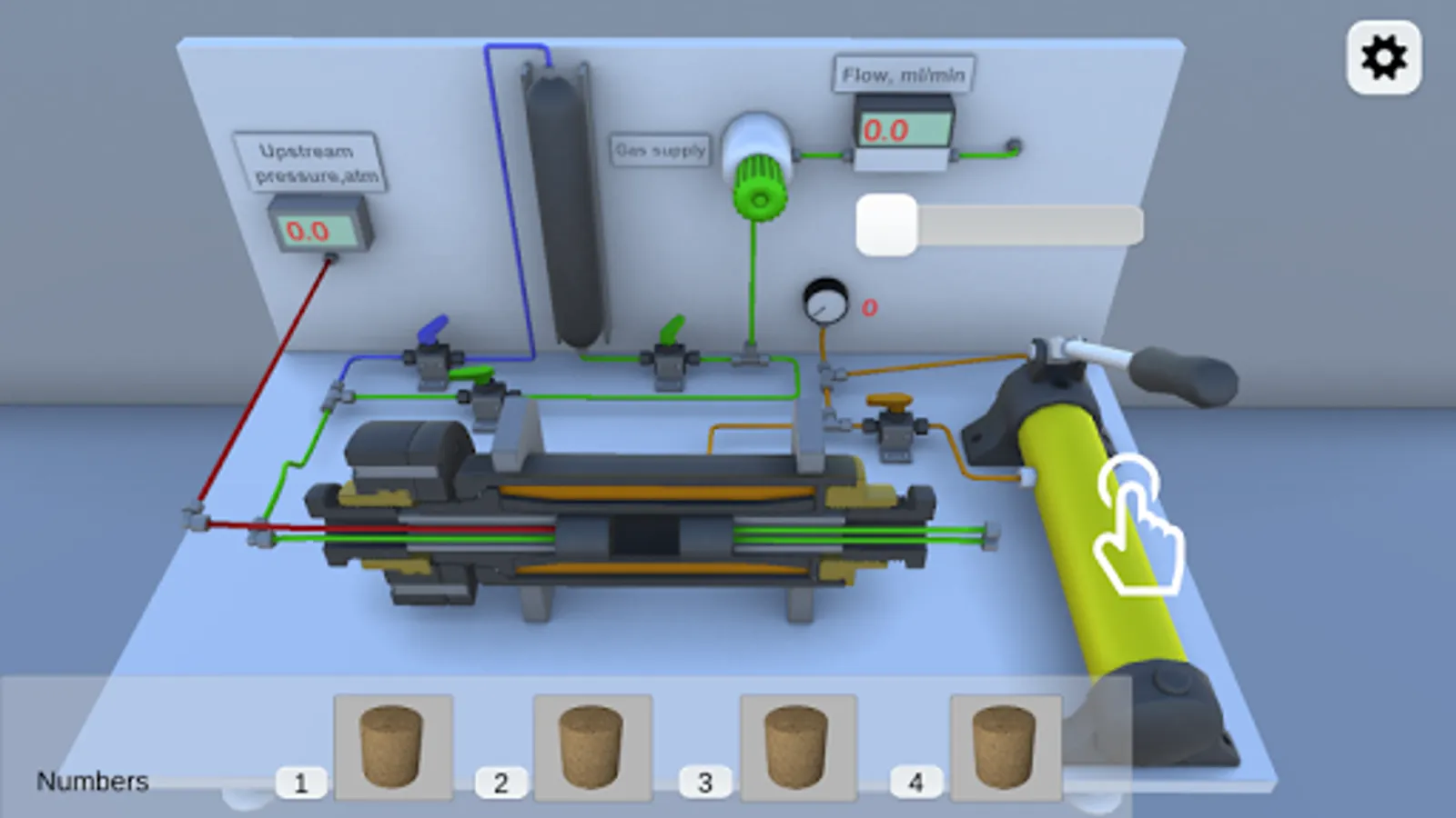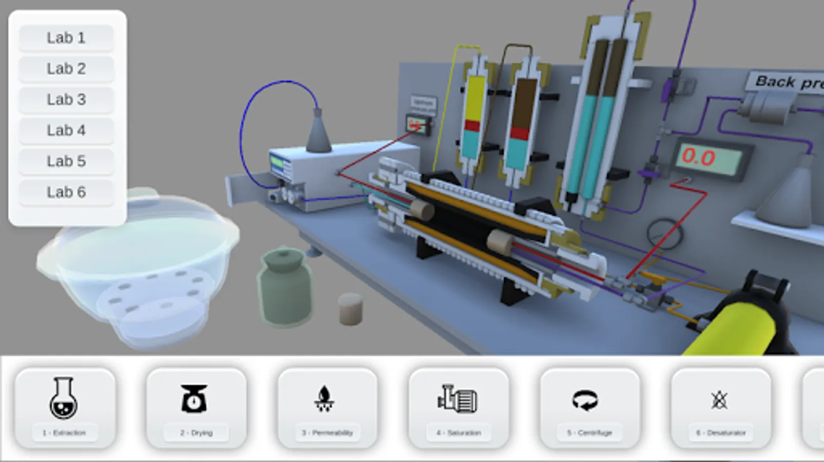 This application is intended for educational familiarization with laboratory research of core of oil and gas wells. The user is invited to take measurements on various laboratory instruments imitating the operation of real installations in a semi-game form. The user receives a core sample with previously unknown properties that need to be determined. Moving from one level-scene to another, the user conducts experiments as a laboratory assistant in a real petrophysical laboratory.