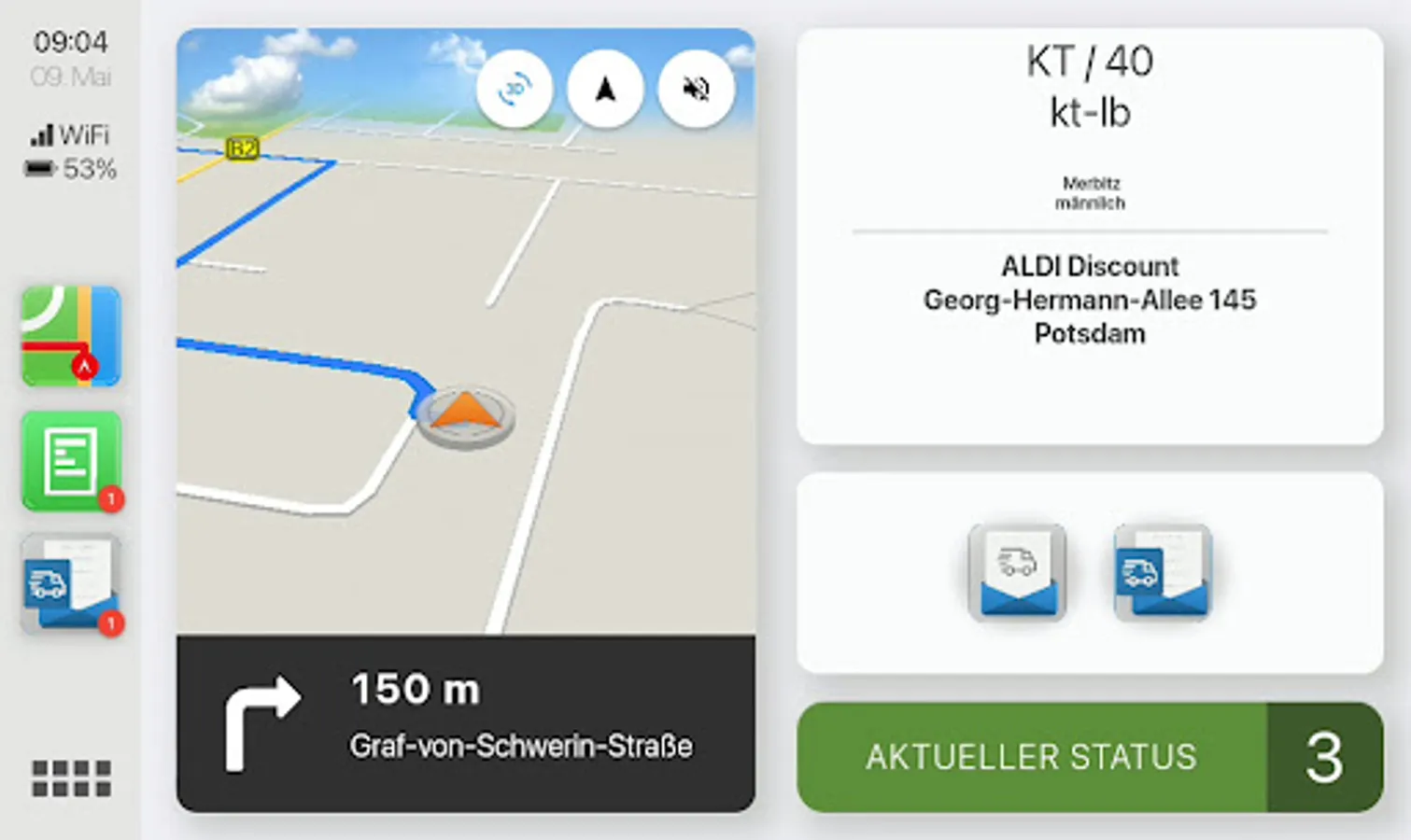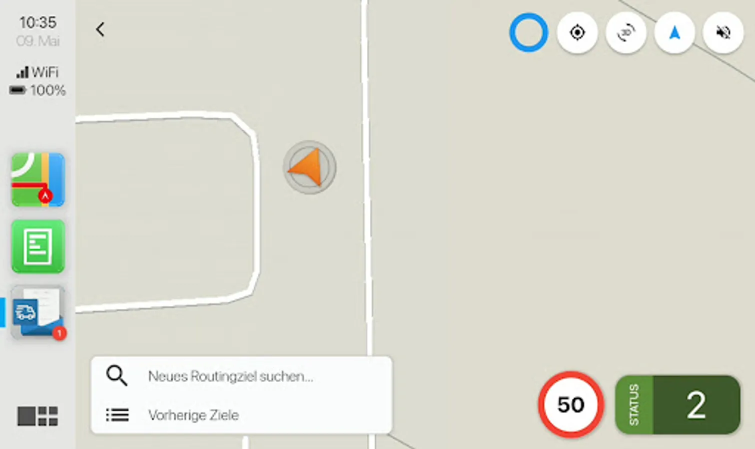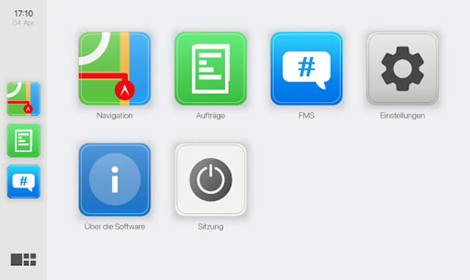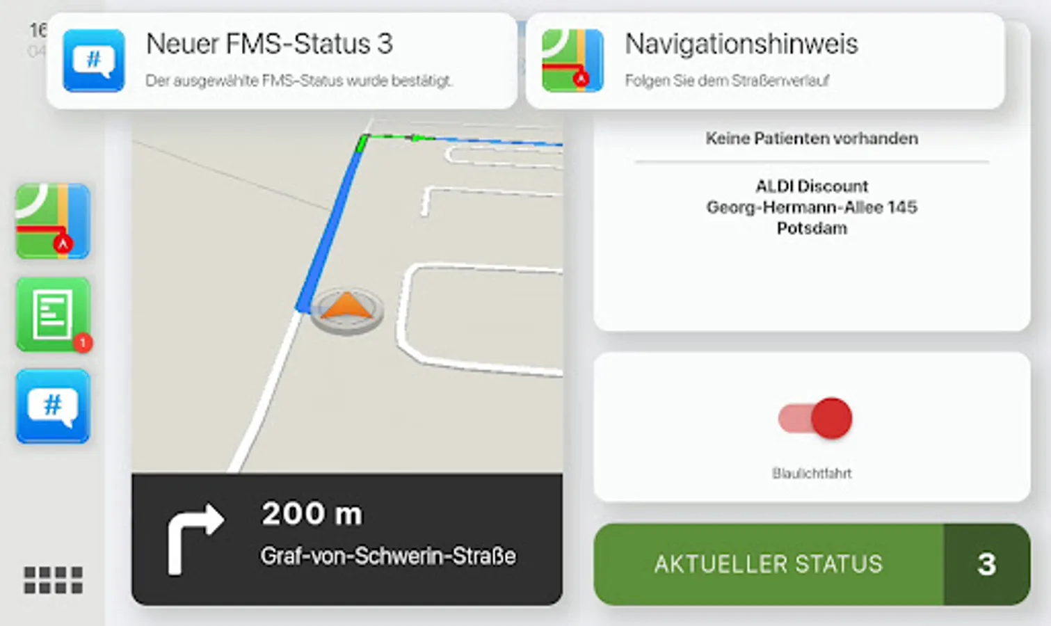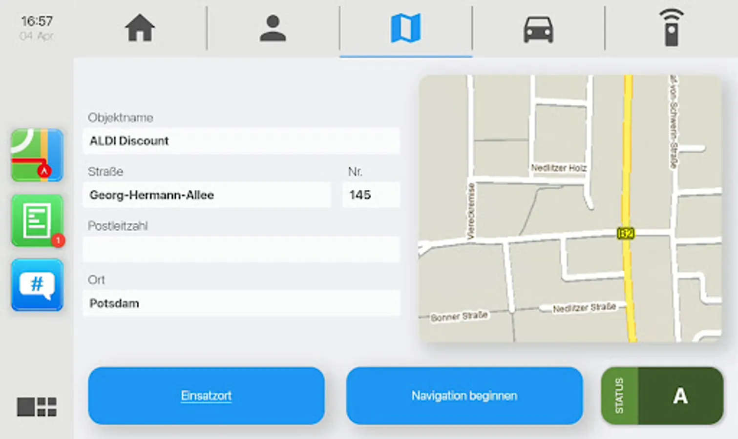 The application includes the display of operational data, status reports, navigation control and feedback on the current location in the operational control system. As a fallback level, the vehicle location can be transmitted back via the GSM channel. Status messages can also be controlled via GSM parallel to the radio system.