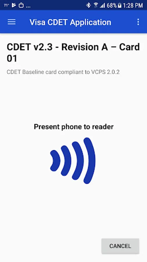 An Android-based mobile application that provides Visa payWave acquiring clients, merchants, systems integrator, and vendors with a convenient, alternative method for confirming that their reader can accept Visa payWave cards during the reader development, deployment, and update stages of the program through execution of Visa’s Contactless Device Evaluation Toolkit (CDET) requirements.