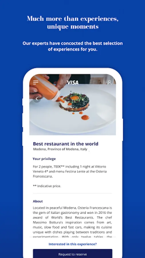 Our experts have curated the best selection of experiences just for you. From cooking workshops in the comfort of your own home, truffle hunting in Italy, private shopping experiences, to discovering an unknown place! Enjoy an experience combining originality and luxury in an exceptional world. Visit the ""Experiences"" section to find out more.