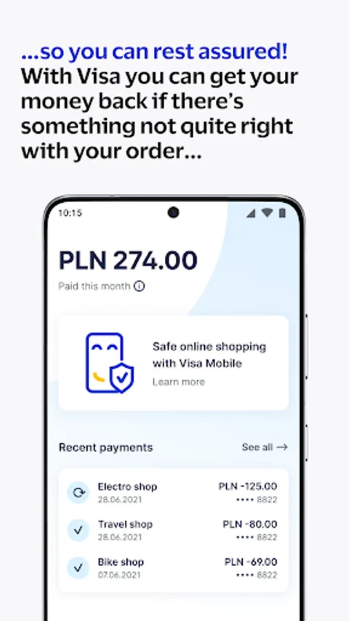 You only have to add the Visa card to the app once – it won’t be necessary to enter all your data again while making online payments. Every time you pay by debit or credit card using the Visa Mobile app, your details are stored in secure Visa systems.