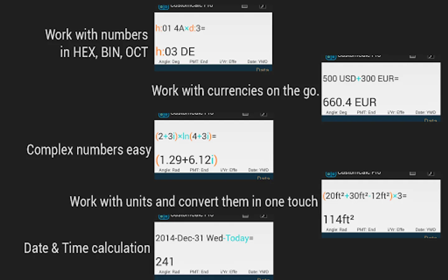 It offers in addition to powerful financial, business, currency conversion, trigonometric, scientific (real and complex), statistical, unit and currency conversion, binary, and date and time calculation.