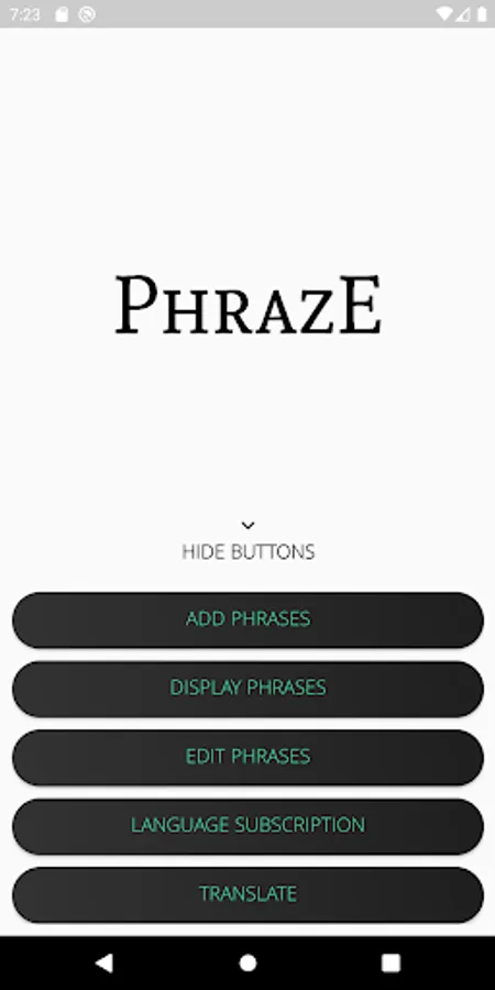 One of the main features of Phraze, this page translates a selected phrase to a selected language. The user can select one phrase that needs to be translated, afterwards select a language and click on the "TRANSLATE" button to translate the phrase.