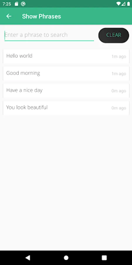 This page displays all the saved phrases in the database. The list of phrases can be filtered by typing the item to search in the search bar.