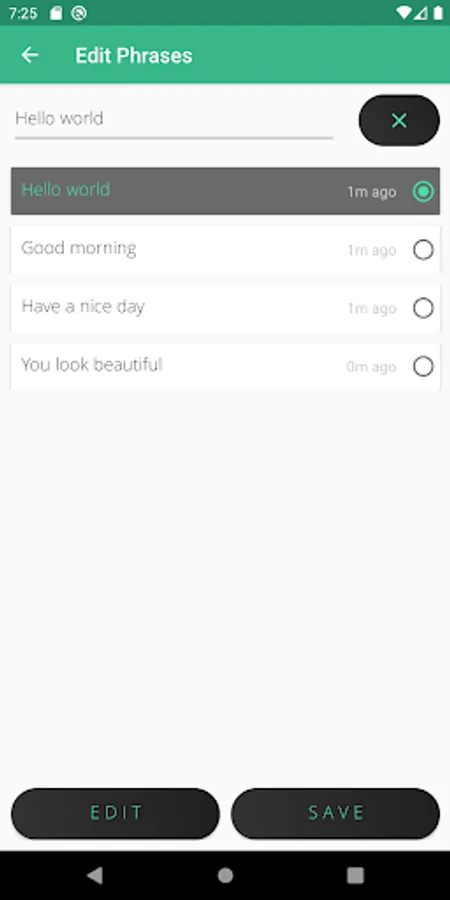 Editing a phrase can be done by selecting a phrase from the saved phrases where after the user selects the "EDIT" button, a text box with the current value of the phrase is shown as a place holder. The user can simply change the value within the text box and click on the "SAVE" button to save the new and edited text into the database. In case the user decides to cancel the editing of the phrase, the user can click on the cancel button shown with an "X".