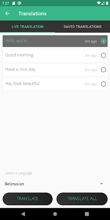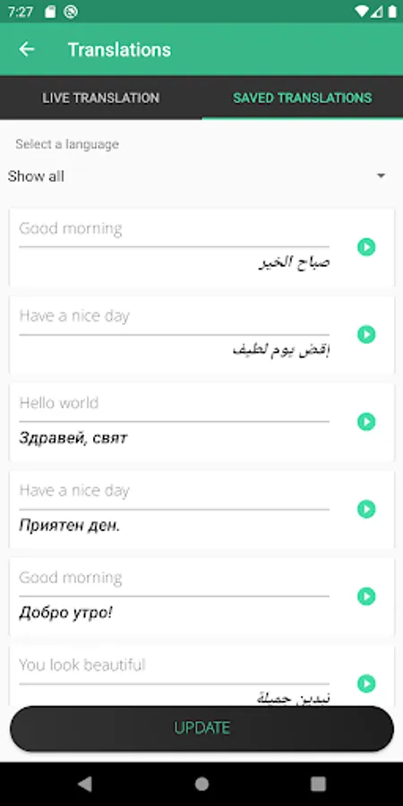The last main feature of Phraze which on click of the "TRANSLATE ALL" button, all the phrases are translated to all the subscribed languages and are saved in the database for offline browsing of the translations. This page has a text to speech provided that an internet connection is available. The results in this page can be further filtered by the translation language by selecting a language from the spinner and clicking the "UPDATE" button