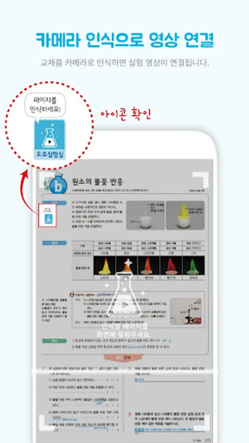 The page with the icon in the O2 textbook is immediately recognized by the camera and linked to the experimental video.