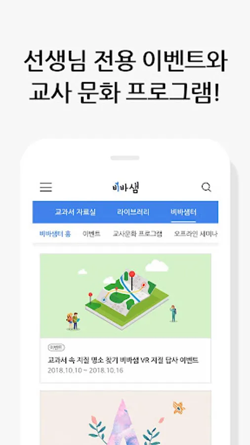 Vivasam provides 300,000 class materials for each elementary, middle and high school subject for free! Now, you can use the rich services of Viva Sam anytime, anywhere through mobile. In addition to downloading class materials, we provide customized services such as recommendation materials based on my subject, real-time notification of new updates, and application for events and teacher culture programs.