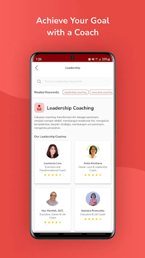 Find a coach and choose one that matches your individual needs and goals. Your coach will then engage with you in continuous coaching sessions focusing on your development area which can be selected from 8 categories: leadership, business, sales, career, self-growth, wellness, parenting, and relationship (love).