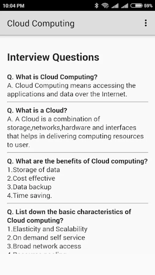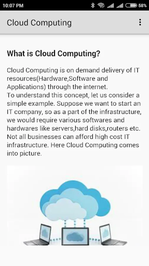 Cloud computing is an emerging technology used by organizations in many different ways in order to help them to save money. Every one of us who are using computers must be aware of this technology. Cloud services are much more less expensive than other services. This app uses simple language to allow users to understand the basic concepts of cloud computing.