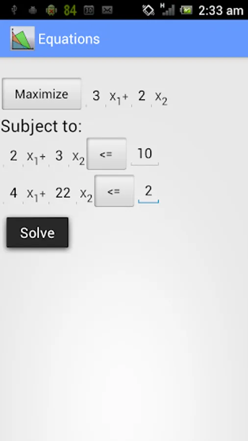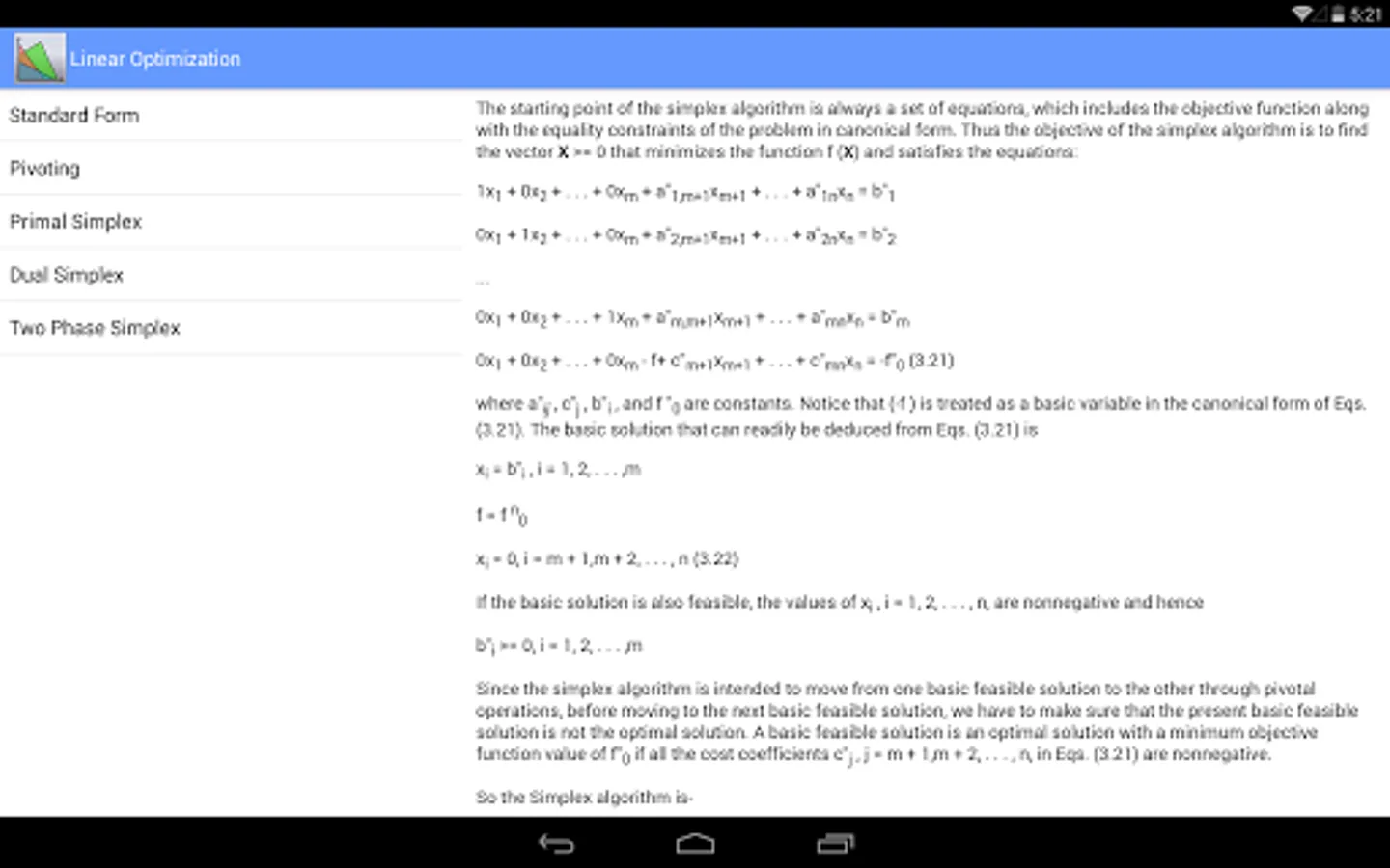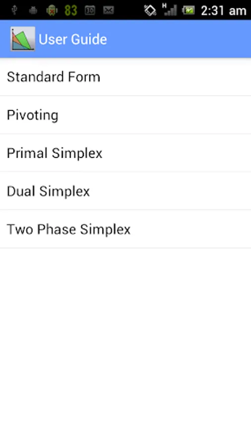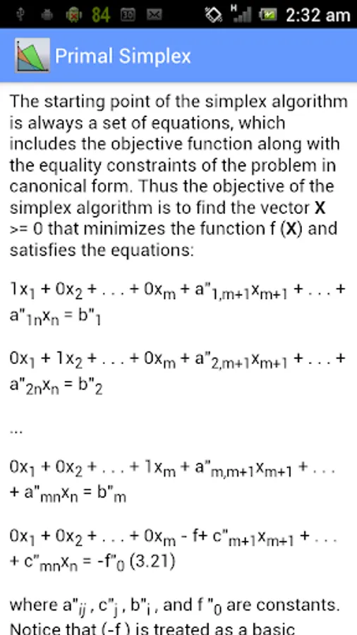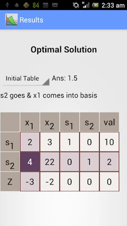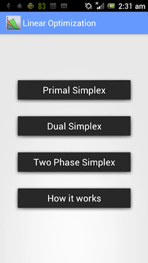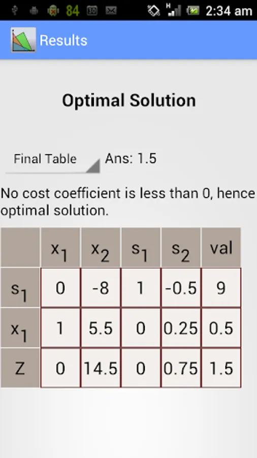 This app solves the linear optimization problems using primal simplex method, dual simplex method and 2 phase simplex method.
