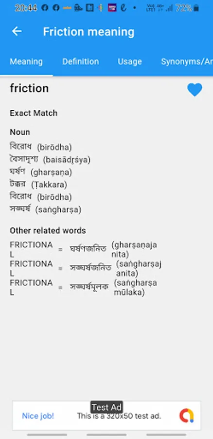 English-Bangla, Bangla-English dictionary by HinKhoj Dictionary. This app is free and provides word meaning, sentence translation, usage, pronunciation and other word related information.