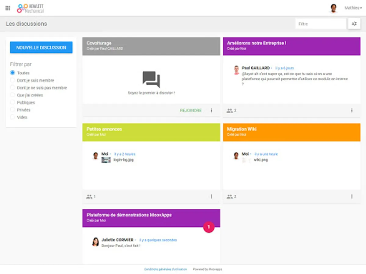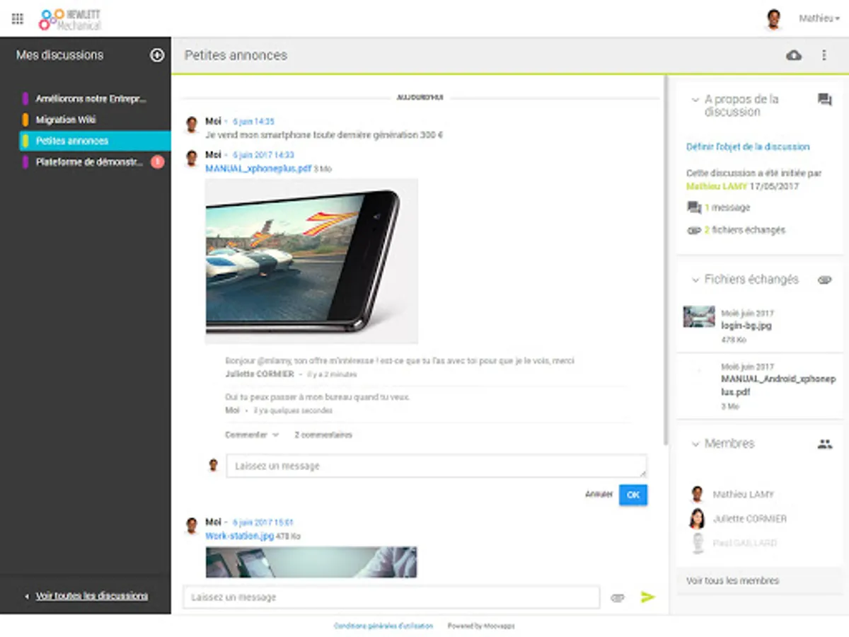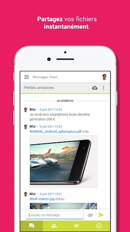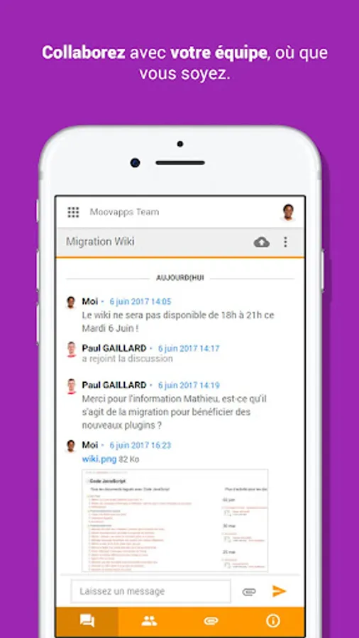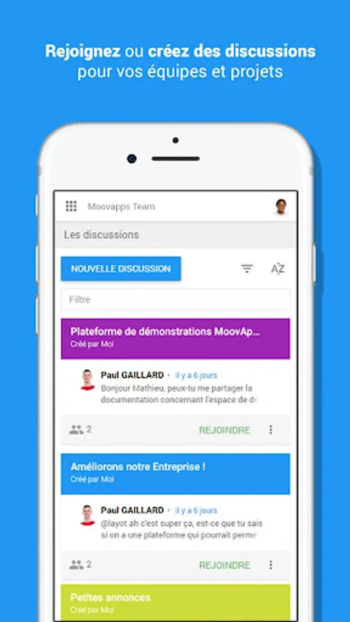 So if you are traveling through the application MoovApps Team for Android, you can continue to communicate with your team from your mobile. You will have access to all your discussions and you will also receive push notifications to keep you informed of new activities.