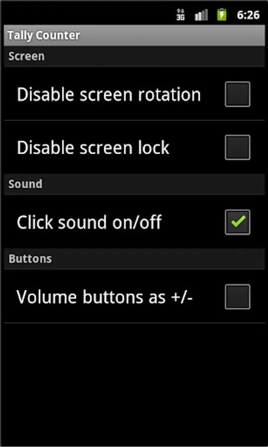 * Preferences screen - disable screen rotation and screen lock, turn the sound on or enable using volume buttons to count
