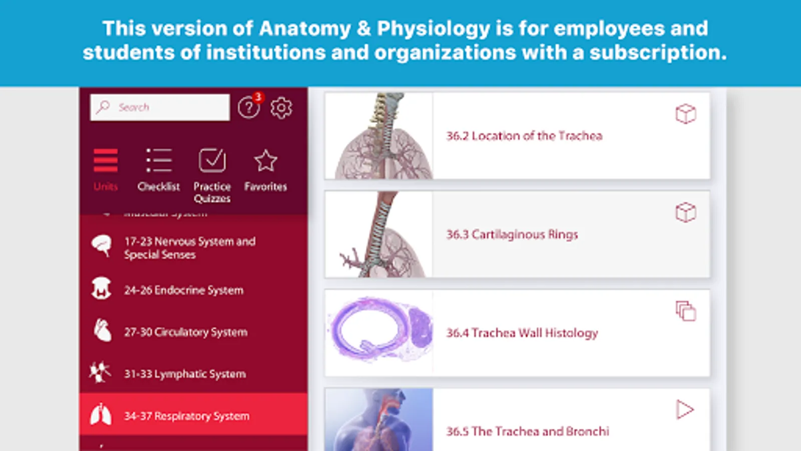 This version of Anatomy & Physiology is for employees and students of institutions and organizations with a subscription. If you’re unsure whether this applies to you, we recommend you search for Anatomy & Physiology by Visible Body to purchase the app.