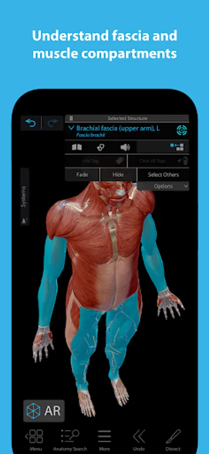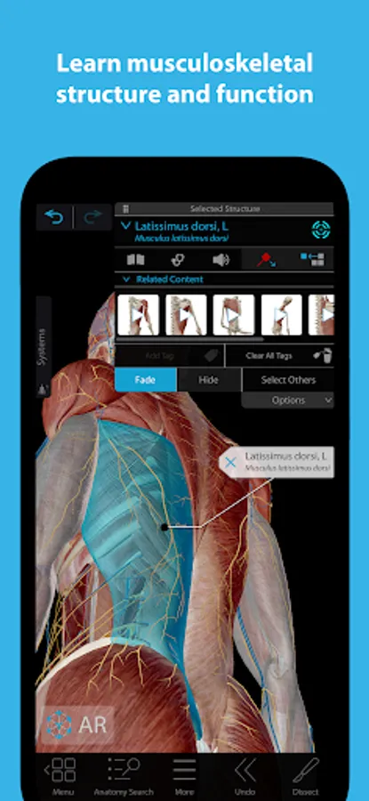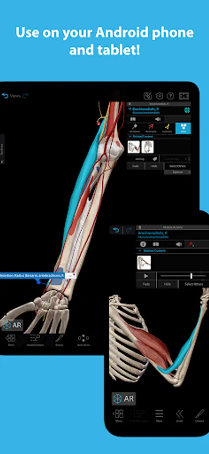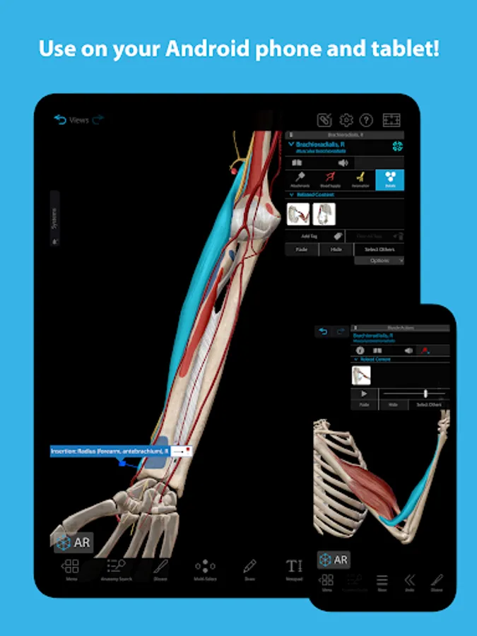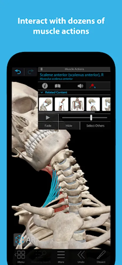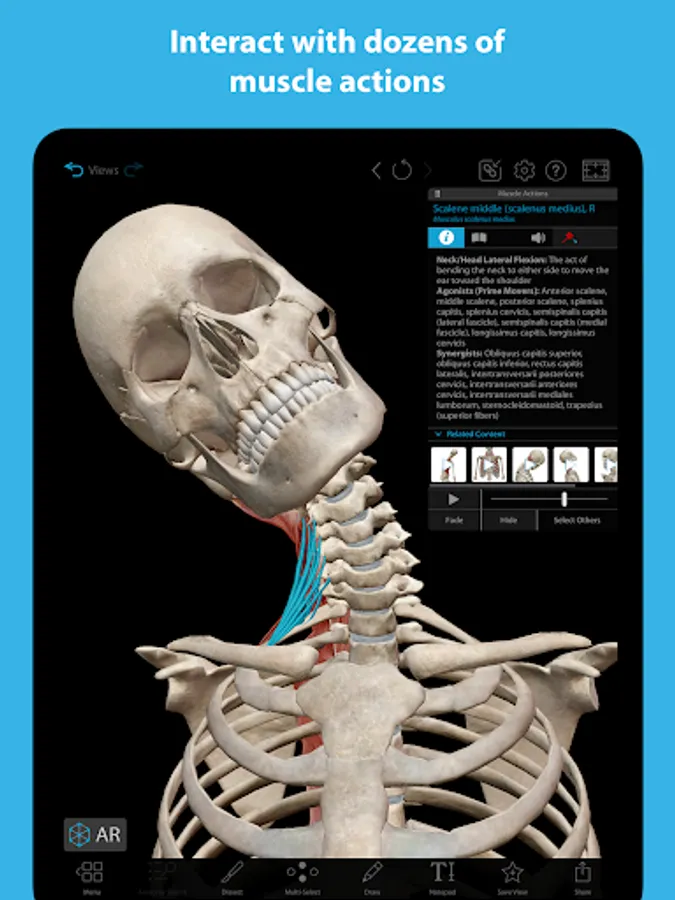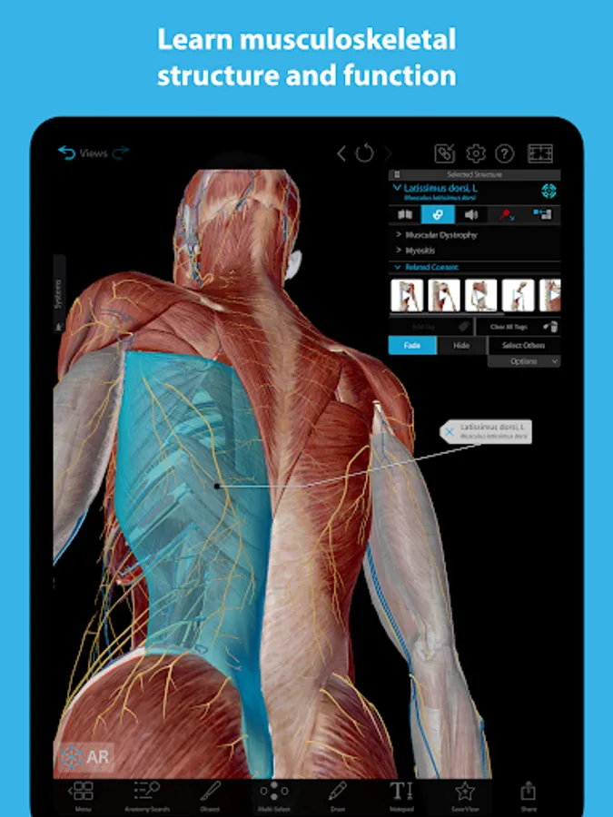 + Access detailed information about any of the thousands of anatomical structures in the app, including in-depth definitions, interactive muscle attachments, bony landmarks, innervation, blood supply, and more.