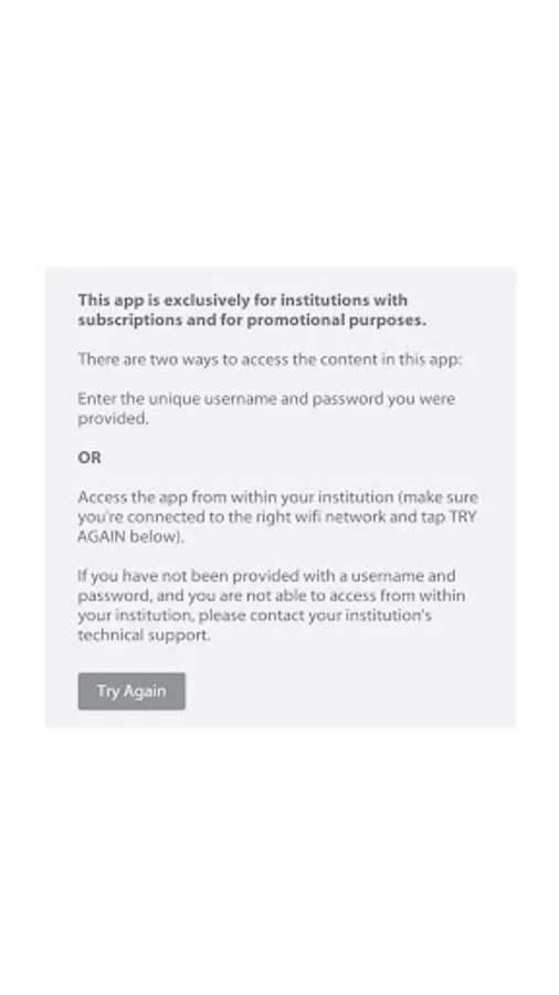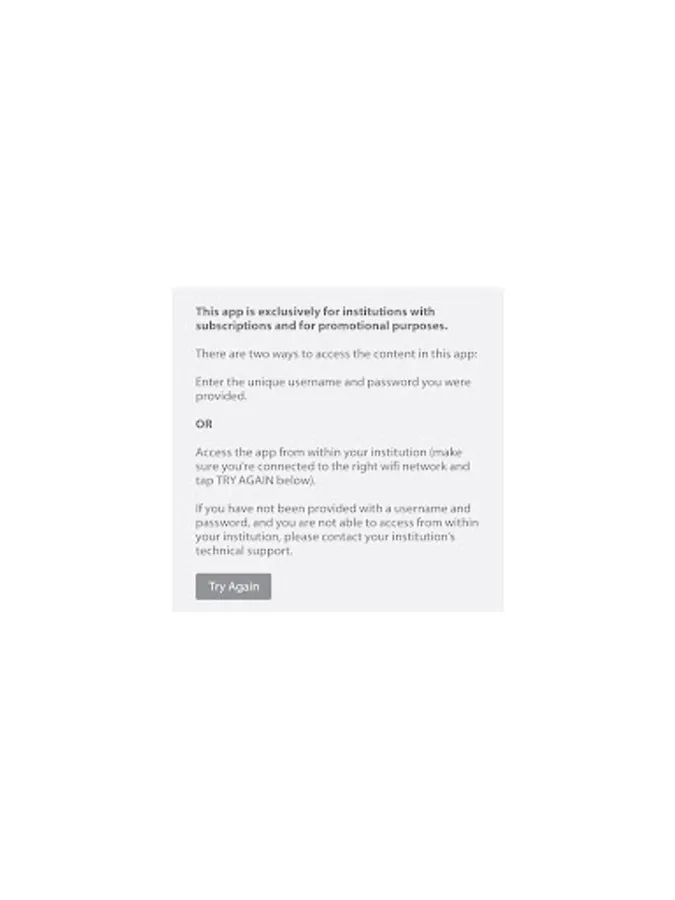 *** There are two ways to access the content in this app: Enter the unique username and password you were provided OR access the app from within your instituion (make sure you're connected to the right wifi network).