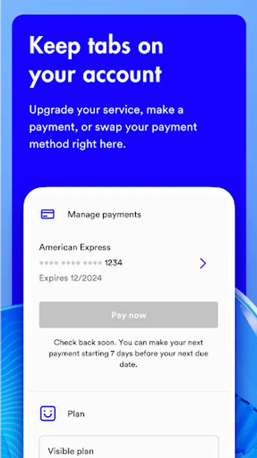 The Visible app makes it easy to manage your service. Make a payment, upgrade your plan, or get 24/7 help in a few taps. Here’s a glimpse of what the app has to offer: