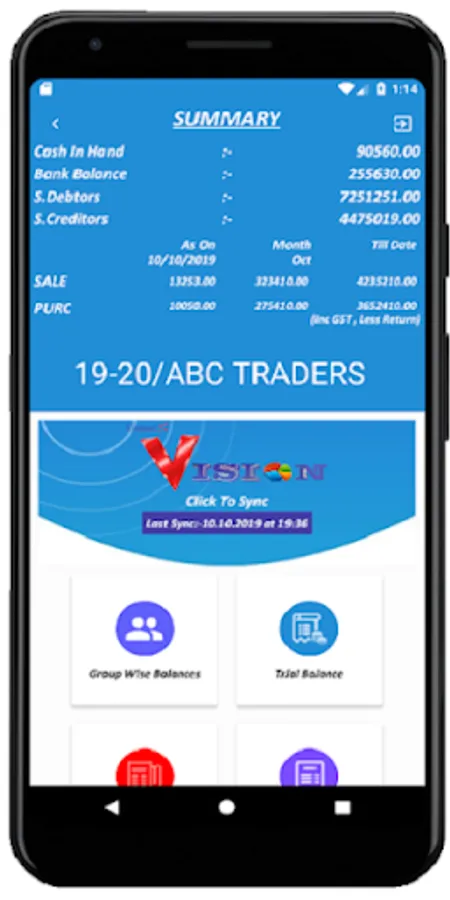 Install VISION Accounting App to view VISION Accounting data on mobile. In VISION Accounting app, User can view the Group wise balances, Trial Balance, Ledger , Account Statement, Bill Wise Registers,Inventory and so on. VISION Accounting App is designed for the users of VISION Accounting Software so they can view their VISION Accounting Software data on their mobile using VISION Accounting App