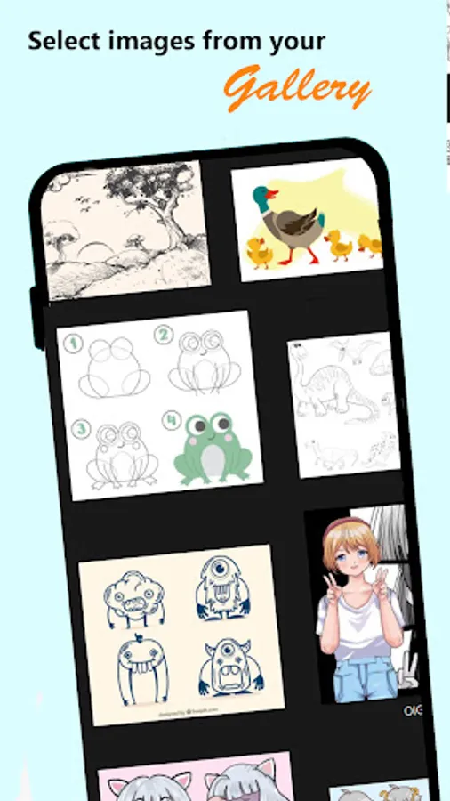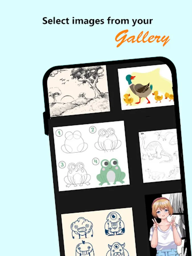 • Select templates for your drawings from gallery: Anime, Cars, Animals, Nature, Food, etc.