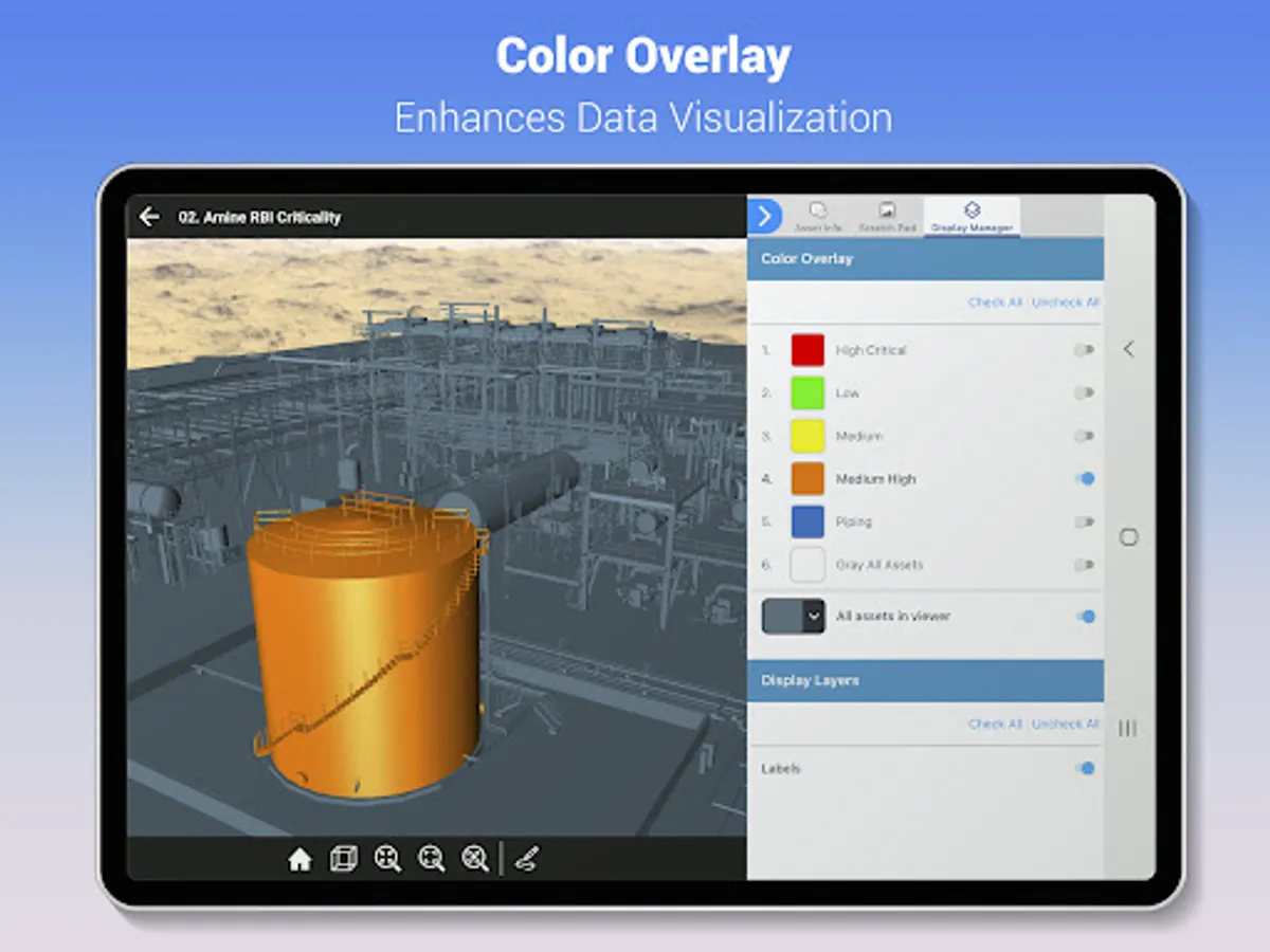 You can view asset related attribute information, including the information from systems of record, and the asset appearances can be changed to identify important operational information. You can manipulate the display in the 3D viewer to efficiently analyze the information.