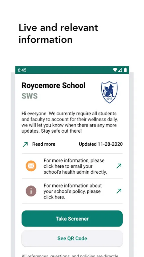 SWS allows for communities to gather and archive wellness information from people entering and exiting their building. Each morning, there is a short screener for users to take, and the results are sent directly to the school administration for follow-up if necessary.