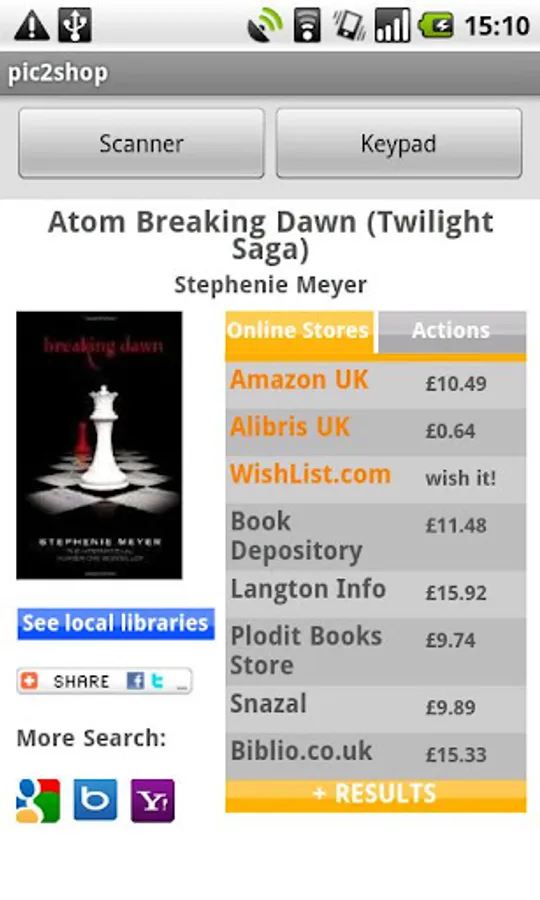 LIBRARY SEARCH: Why pay when you can check things out? Pic2Shop searches local libraries for what you are interested in and will even tell you if it’s checked out (and when it’s due back!).