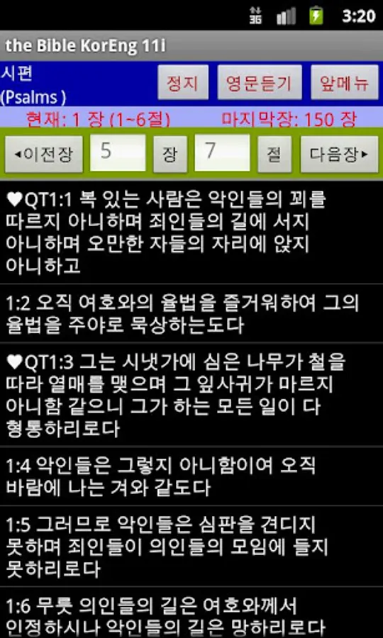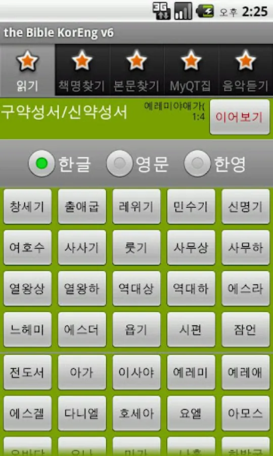 When you click the button the user wants to read, you can view all the selected book chapter name. N n If you press and hold the appropriate section on the List, you can select the QT save and bookmark storage, easy to navigate to other sections in this chapter as I read today You can. n n