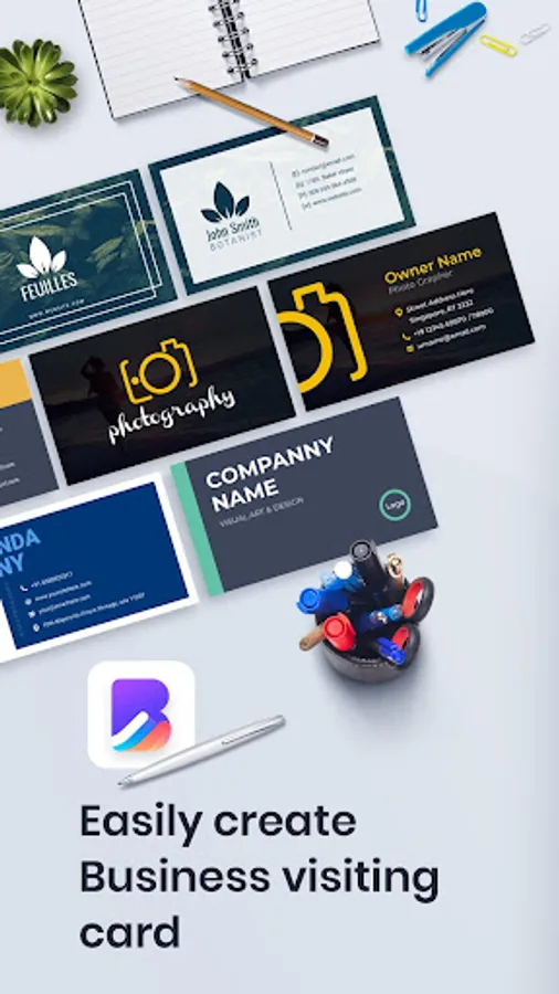 The business card templates, visiting card samples helps you create a best business card designs by own. You can also create QR code from internet and add the image to visiting card. Business card scanner app will scan your name card faster.