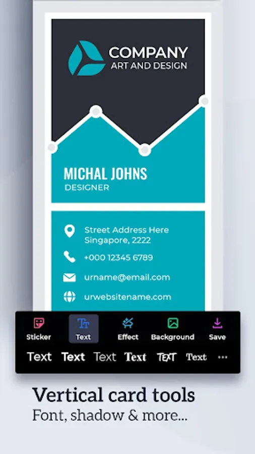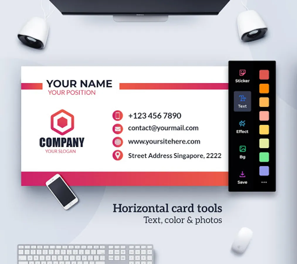 Plenty of business card templates, creative stickers, text arts, various shapes, and graphic design. No graphic design skills required. Create an amazing business card with templates.