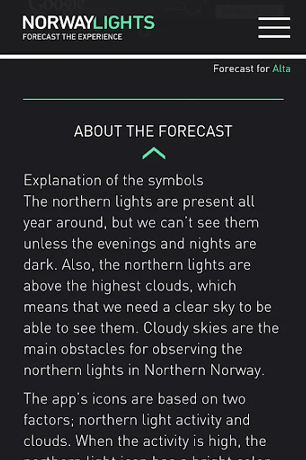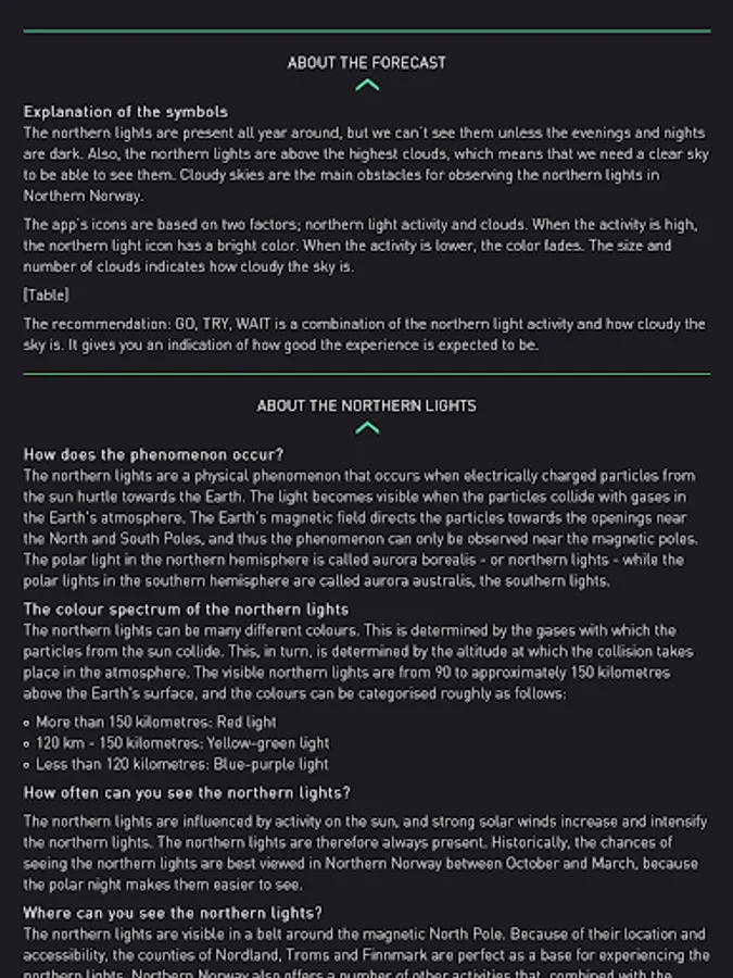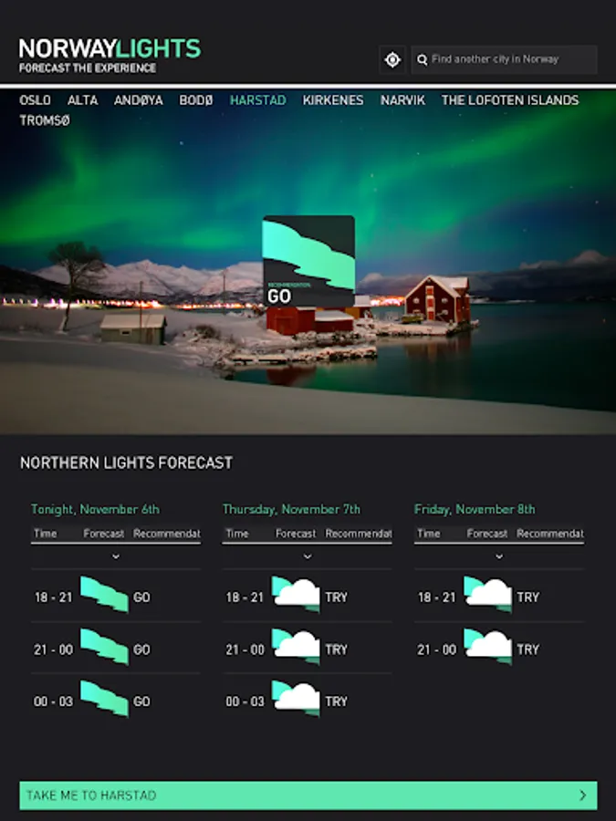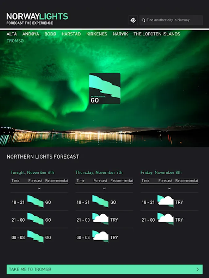 Visit Norway, the official travel guide to Norway, gives you a user-friendly northern lights forecast app with an overview of places known as “northern light cities” in Norway. The interface of the app is slick, yet simple, which sought to provide nature-loving explorers guidelines in regards to when to go, where to go and how to get there.