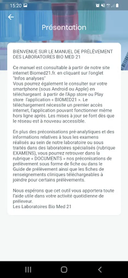 LBM BIOMED 21 is a medical application aimed at providing a collection manual for health professionals (nurses, biologists, doctors).