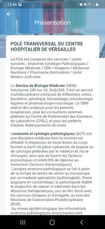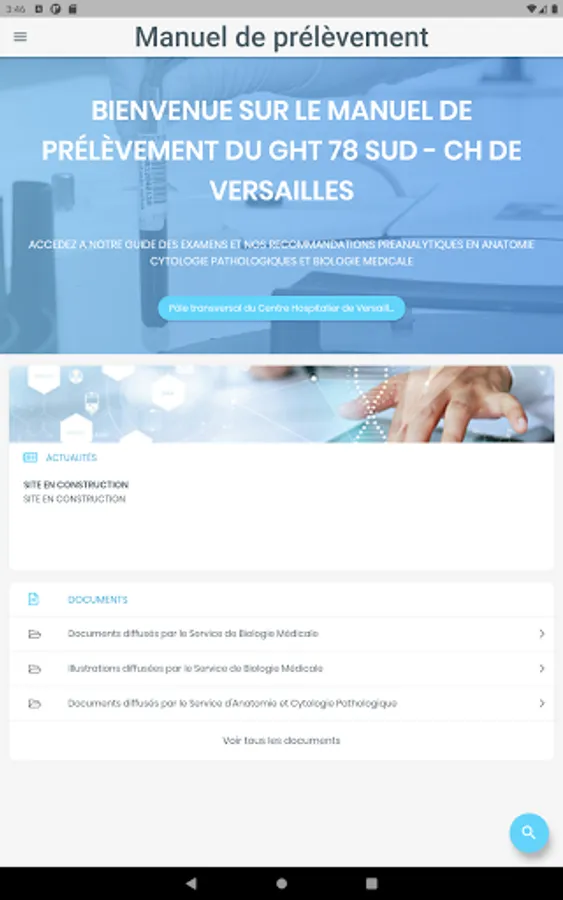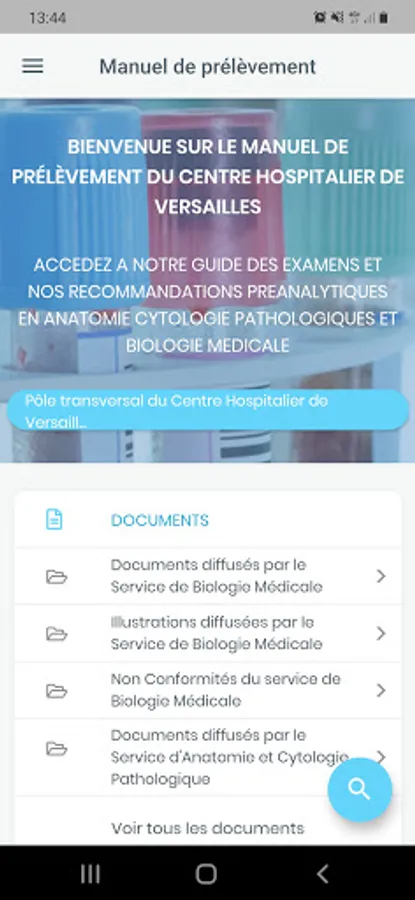 CH Versailles is a medical application intended to provide a sampling manual for the use of health professionals (Nurses, Biologists, Doctors).