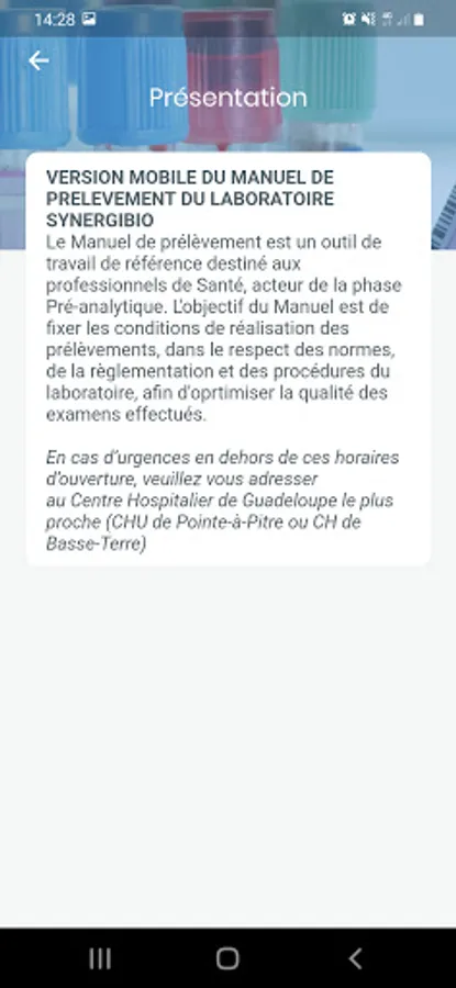 SYNERGIBIO is a medical application aimed at providing a sampling manual for the use of health professionals (Nurses, Biologists, Doctors).