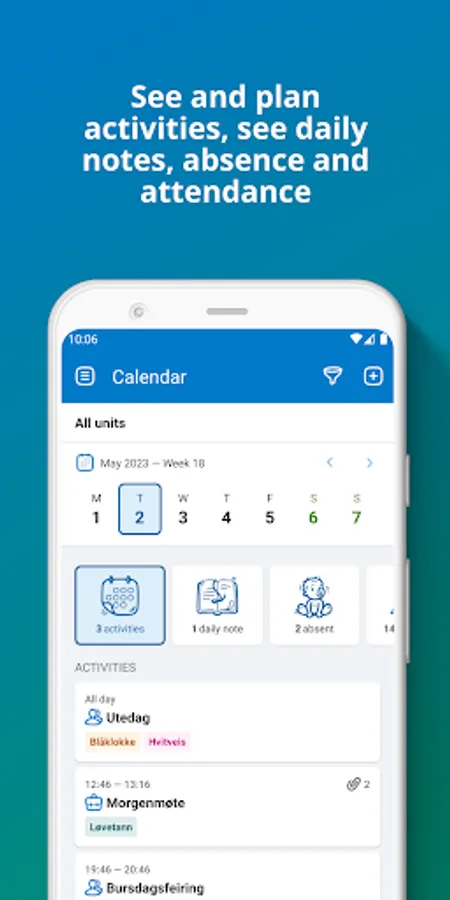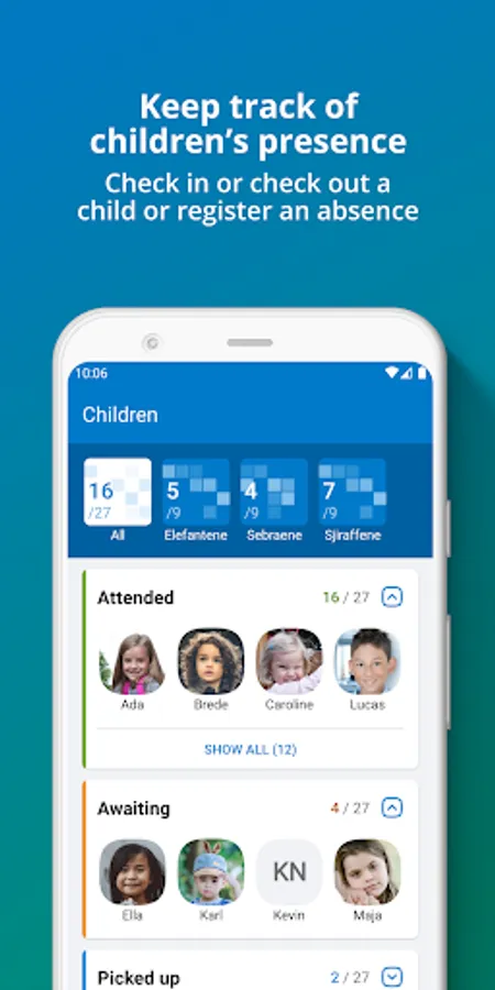 Min Barnehage Ansatt gives you as an employee a good overview of all children in the kindergarten. You will be able to check in and out children and keep track of absence.