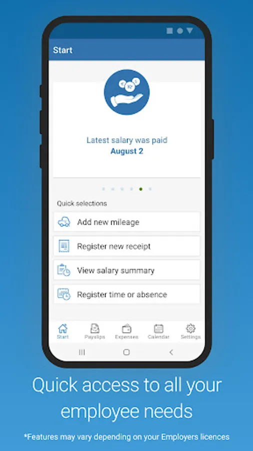 Stay updated with the latest information: Access your payslips and receive automatic notifications for incoming new ones. Register receipts and mileage expenses and send them for approval. Easily enter your work hours, register your sick leave or apply for vacation on the go.