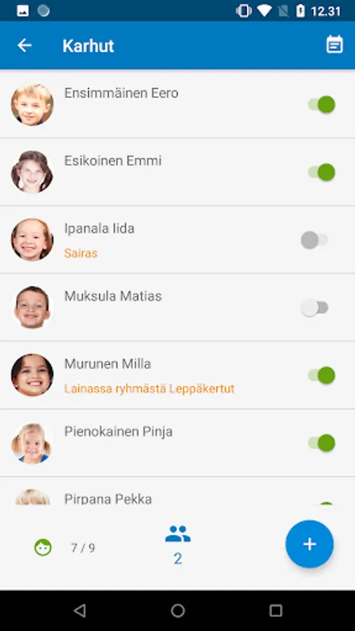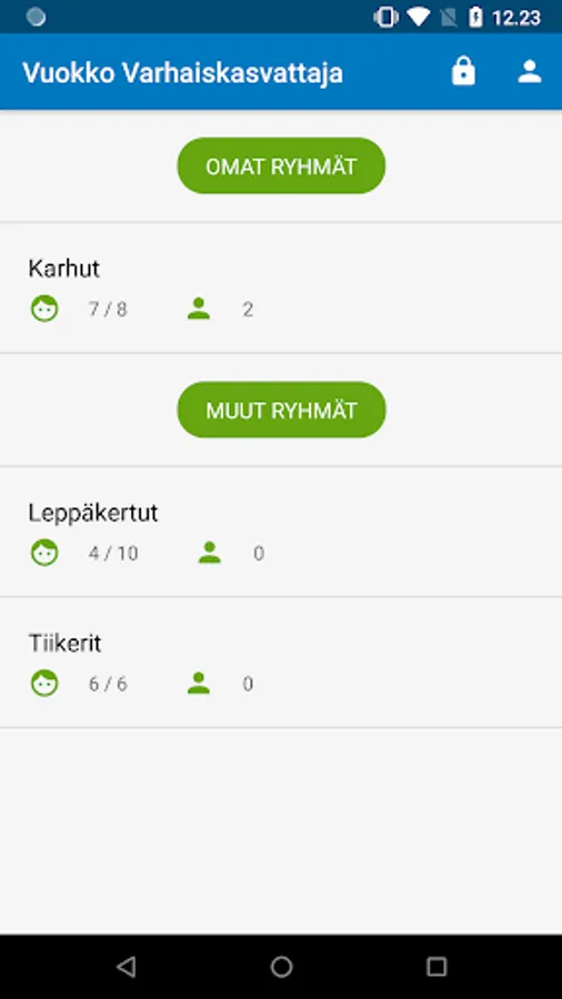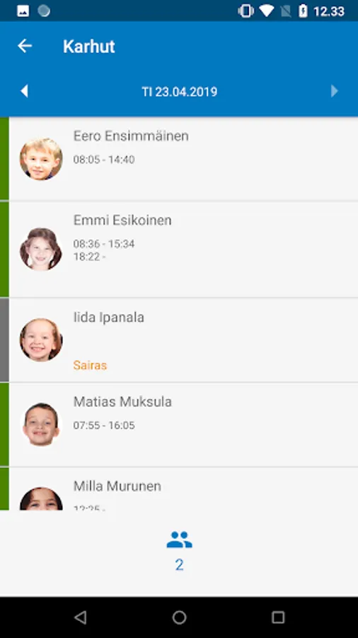 The application can be used to manage children's check-in and check-out, to pick up children from other groups one by one for their own group during the day of care, and to mark children's absences. You can also enter the number of staff in the group on a daily basis. The app has a history view where you can conveniently browse each day’s entries, entries, and number of staff and correct them as needed.