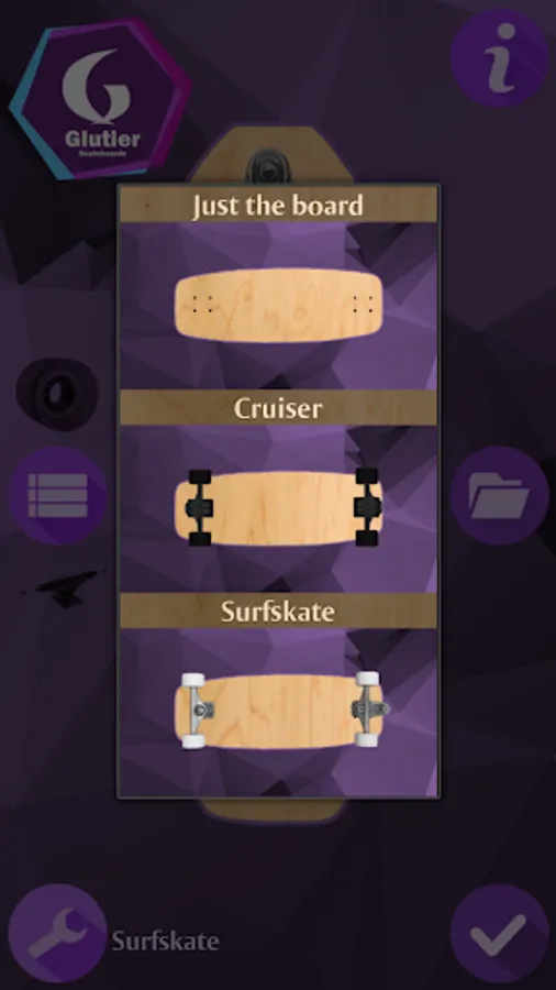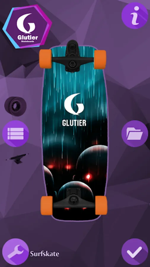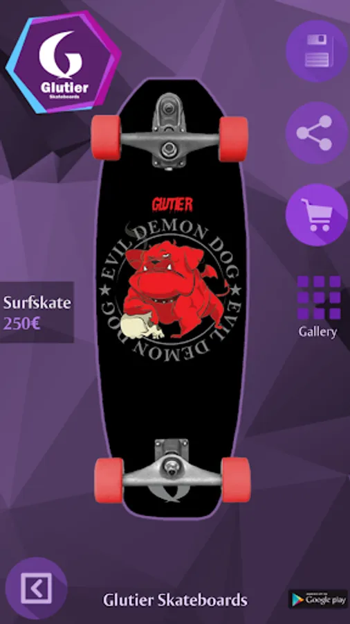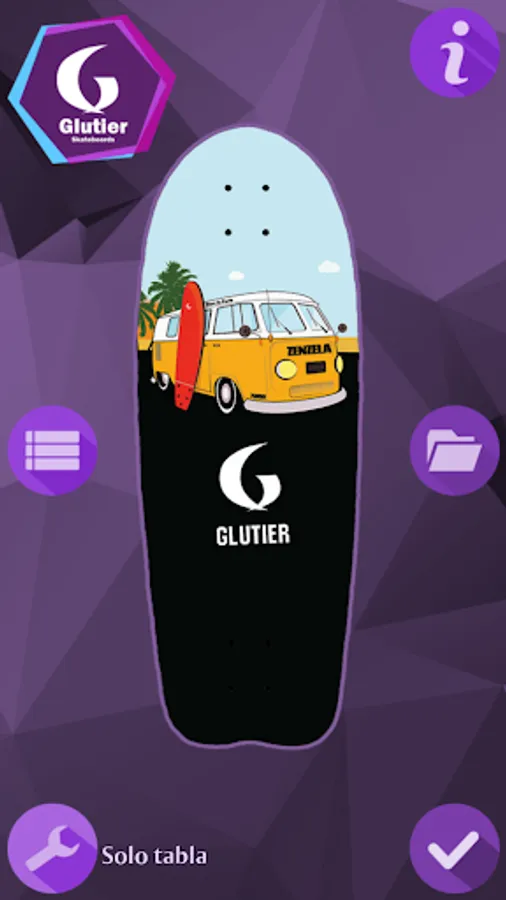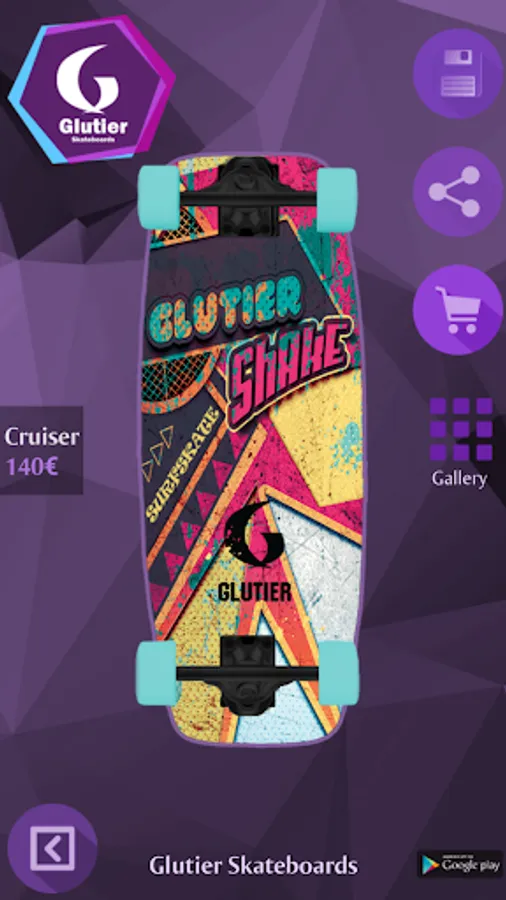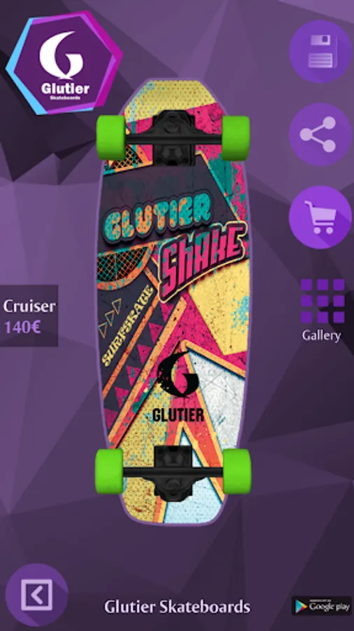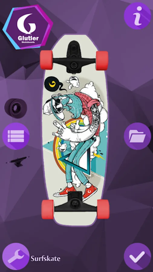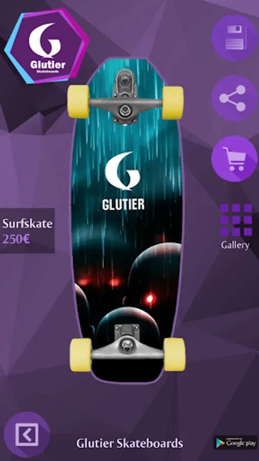 With Glutier Skateboards you can design your own skateboard, longboard or surfskate in a fast and fun way. Just choose the board model, add a picture and select the trucks and wheels that fit to your design. Once completed you can save it, share it with your friends or make the purchase of your custom skateboard to Glutier Skateboards. Surf everyday!!