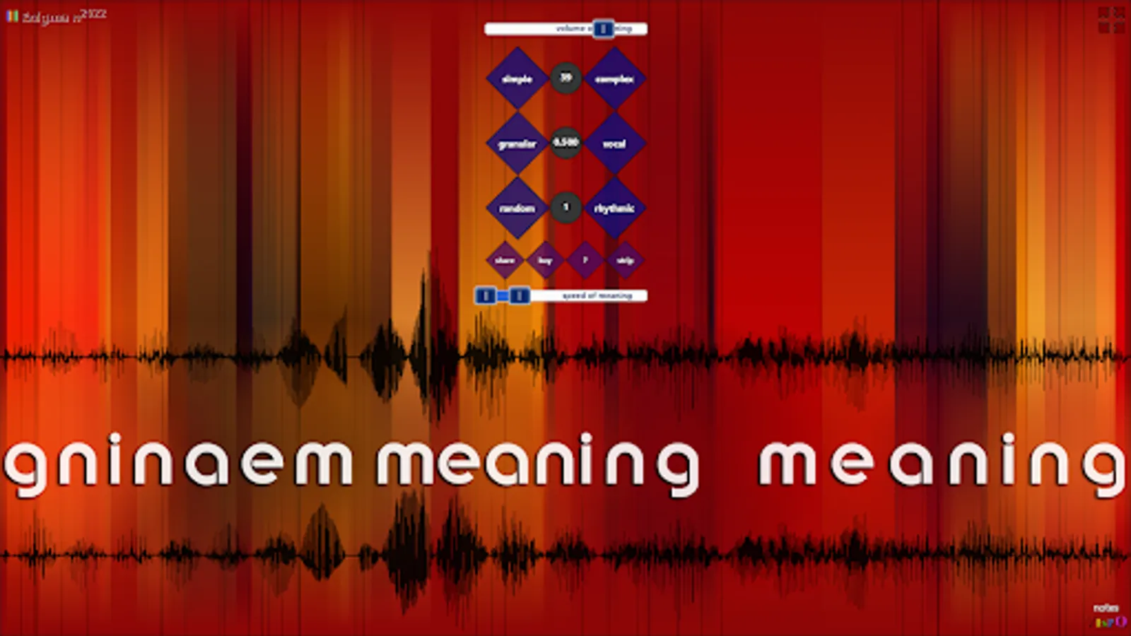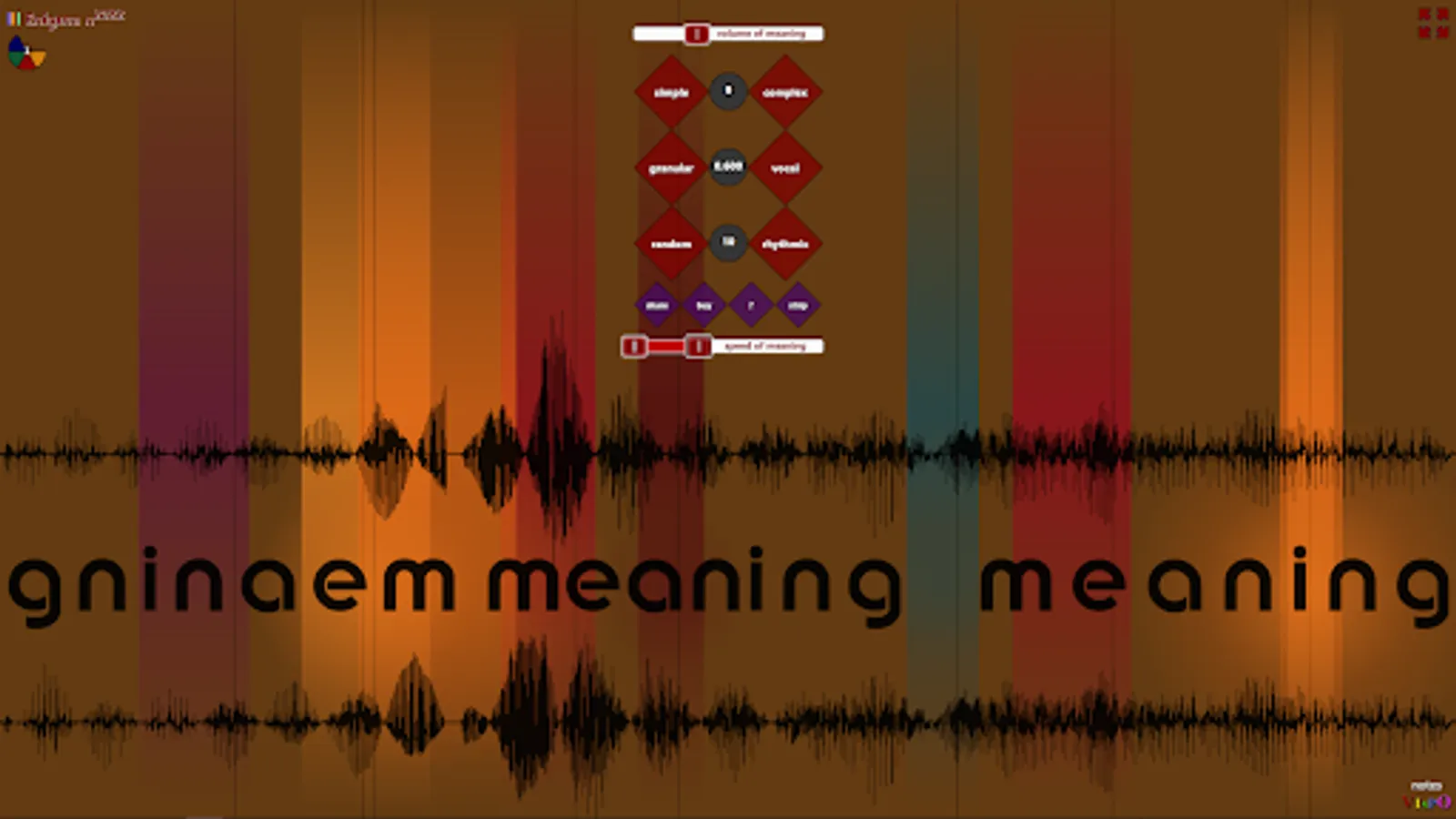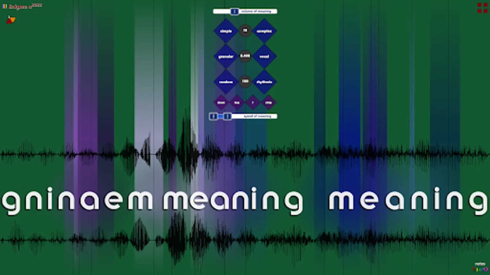 Set the speed of meaning slider, the audio pitch range, from 10 octaves down to 2 octaves up. You glimpse different worlds in different levels of pitch—though the 5-second audio source sound is the word 'meaning' intoned thrice,
