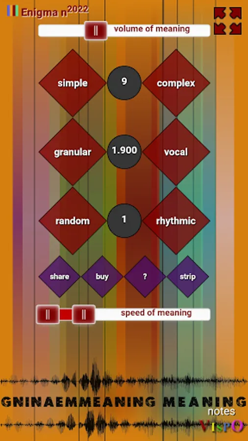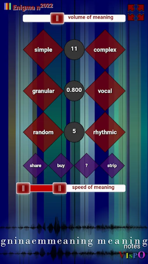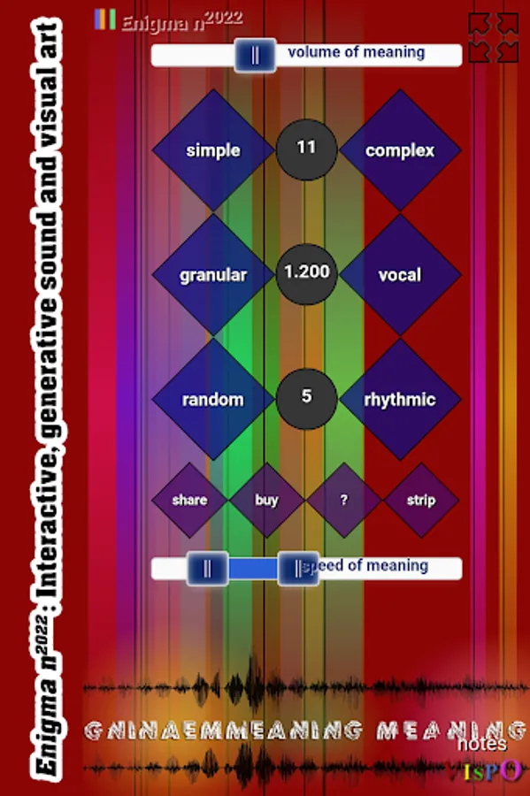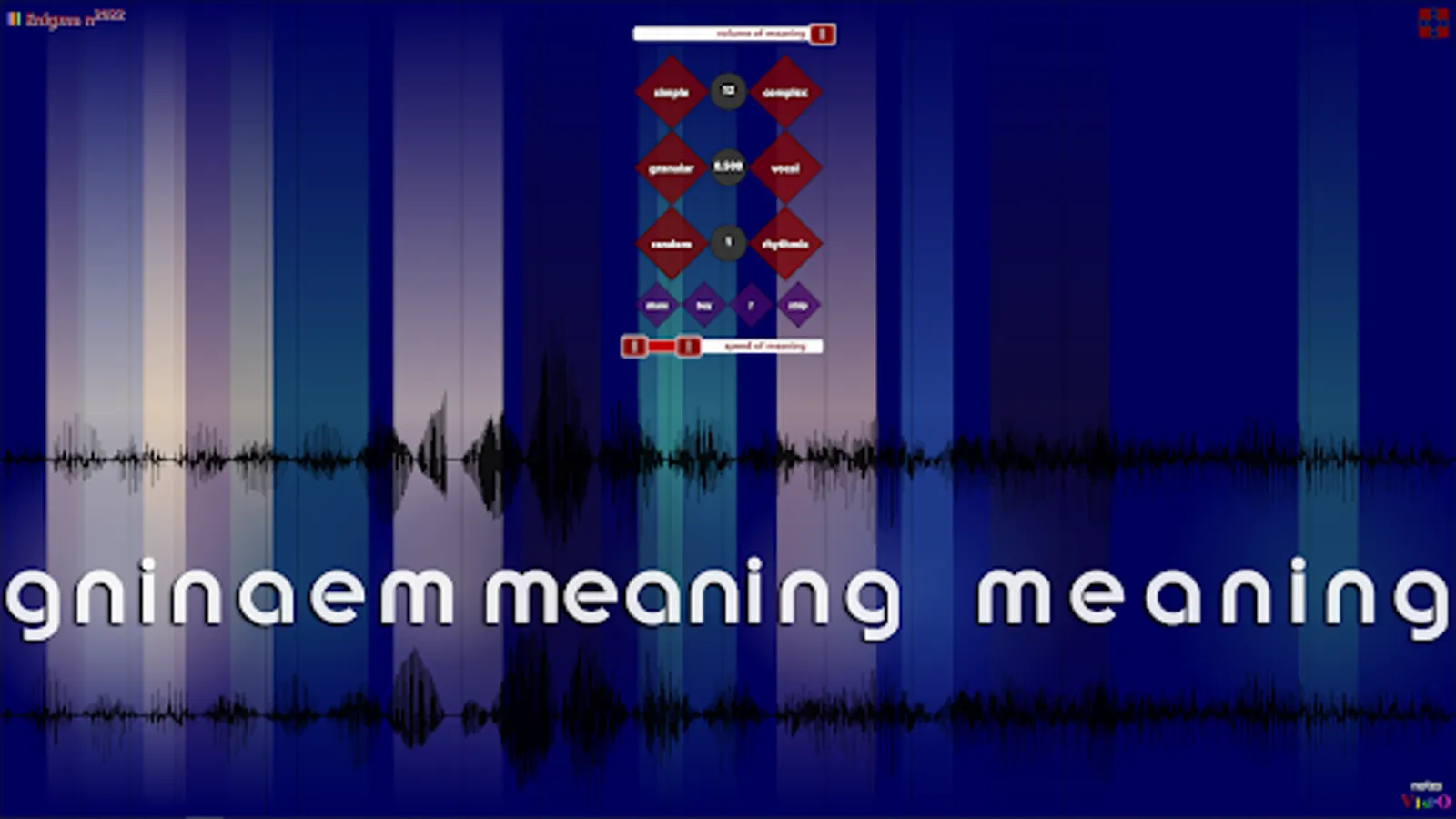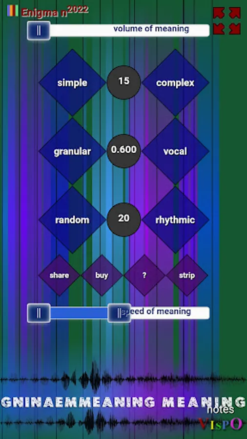 Set the speed of meaning slider, the audio pitch range, from 10 octaves down to 2 octaves up. You glimpse different worlds in different levels of pitch—though the 5-second audio source sound is the word 'meaning' intoned thrice,