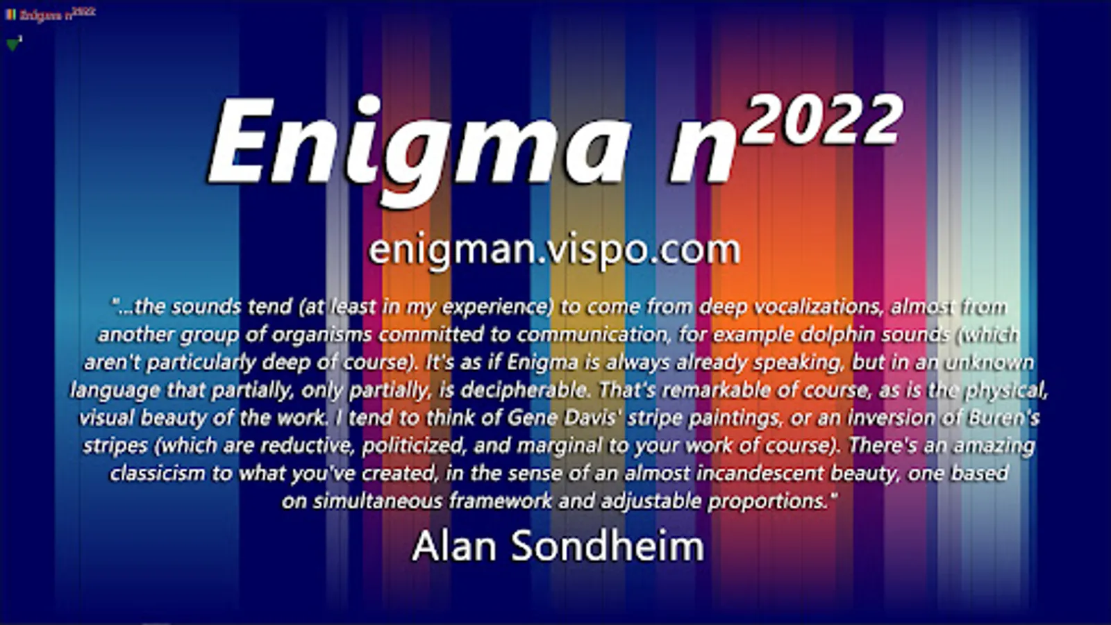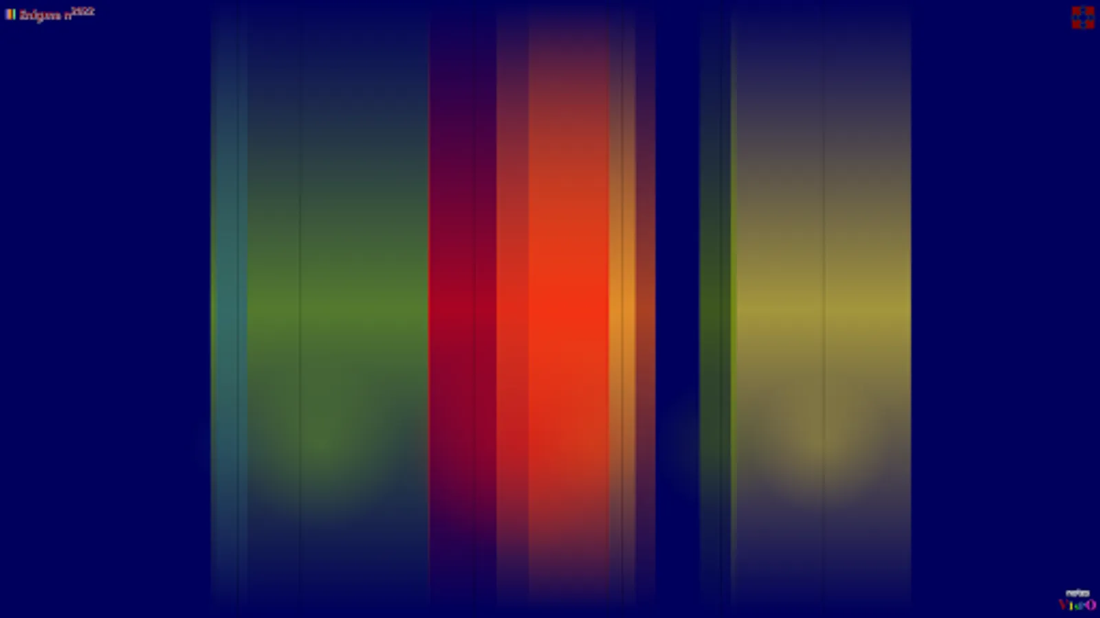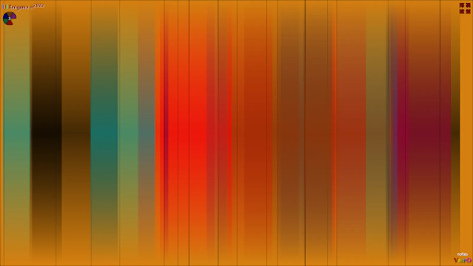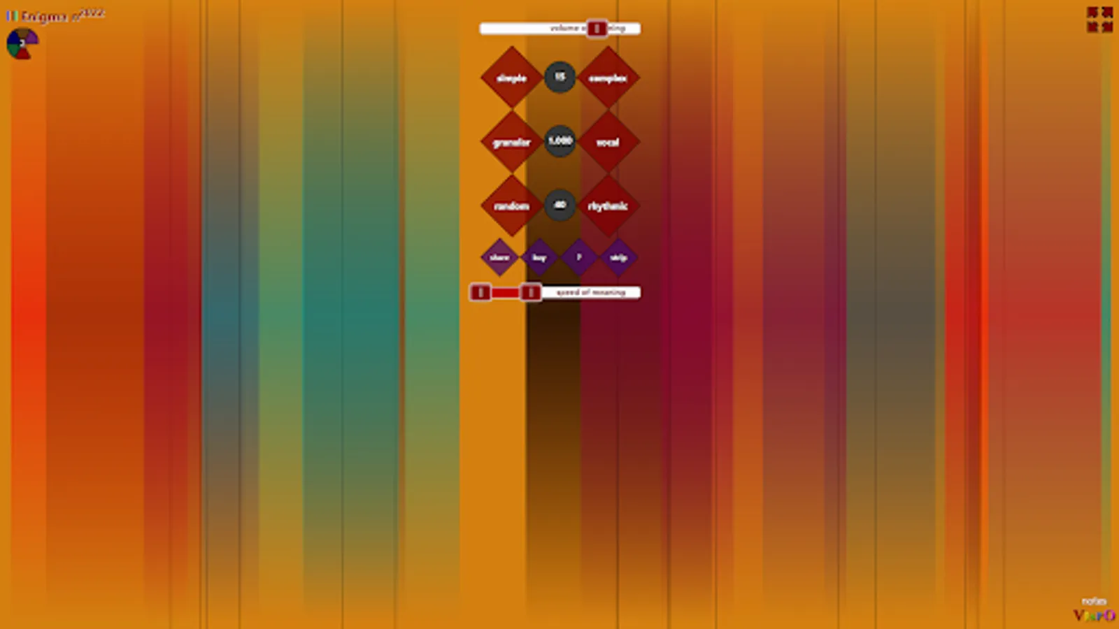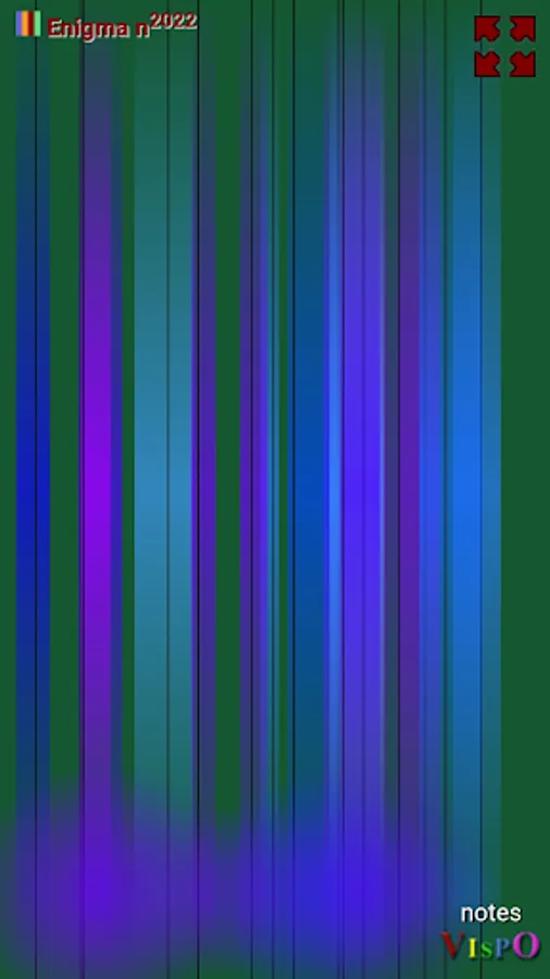Color music is in the combination of colors. Use the 'color' button (or the 'x' and 'c' keys) to cycle through the palettes. Each of the 6 background colors has a different set of 30 palettes associated with it. 'x' is for 'previous palette', while 'c' is for 'next palette'. You'll then see info such as “Palette 10 has 5 colors”. Since the stripes are not fully opaque and often overlap, that produces new colors not among the colors of the current palette. The color is generative, in that sense. The audio is generative as well in that it consists of slivers sampled randomly from 'gninaem meaning meaning'. The meaning is generative, but by you, in your interpretation of it.