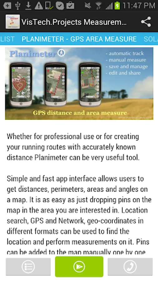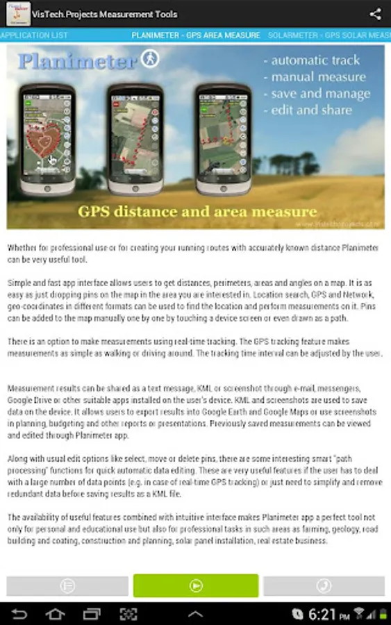 Our mobile tools cover wide rage of measurements and application areas - from small object and dimensions in sub-mm range to land measurements on a map and tracking. Some of the apps use GPS, camera hardware, tilt sensors to make measurements possible.
