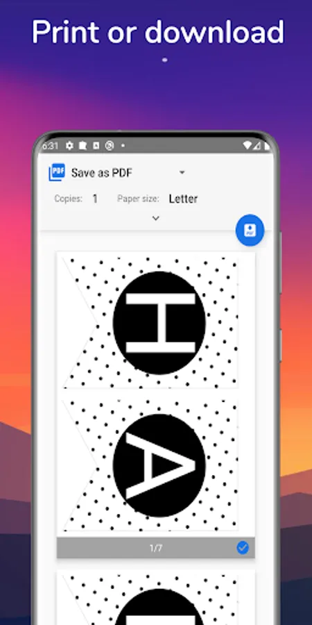 Once you have finalized the party banner you can print or download. You can directly connect to printer from app itself or download as PDF file and get it printed from outside store.