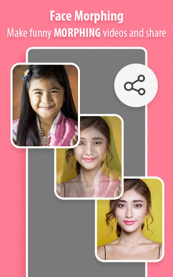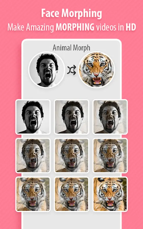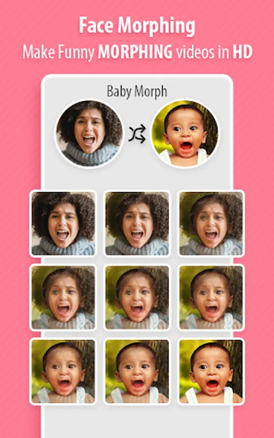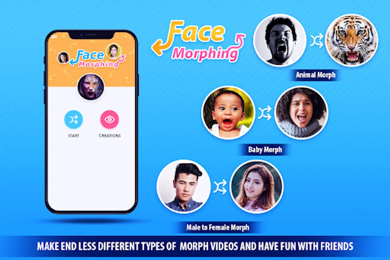 This is the funniest app to create face blending videos between 2 photos. You can create videos from baby face to older, young to old look, human to animals and many more with creative features. It's an Userfriendly app to create face blending videos between two photos.
