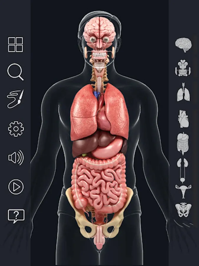 Organs Anatomy app User can select each Organs separately to view name of the Organs or read related information.