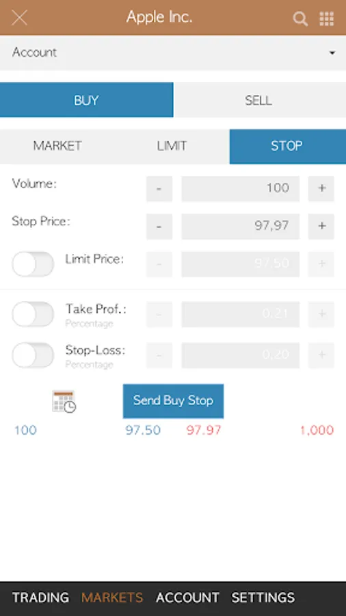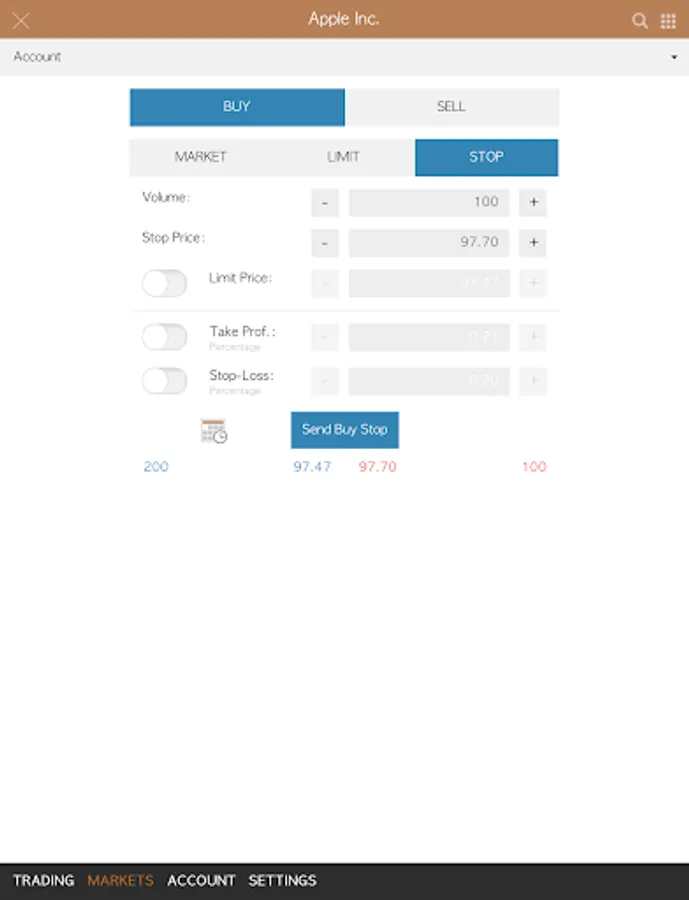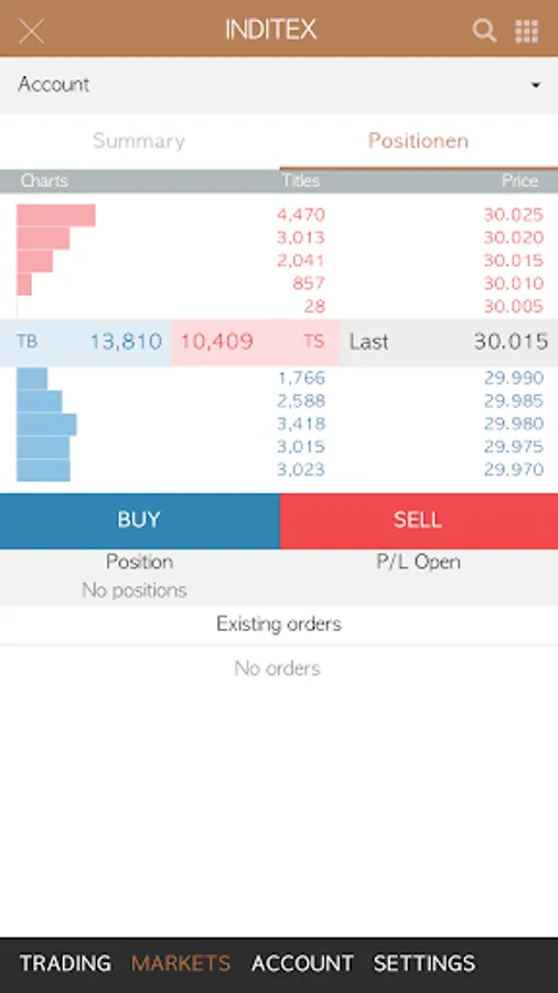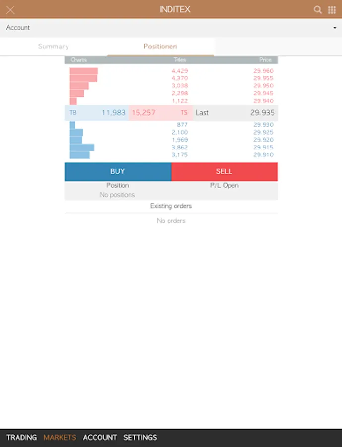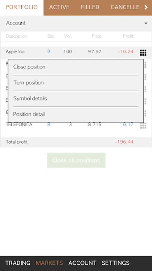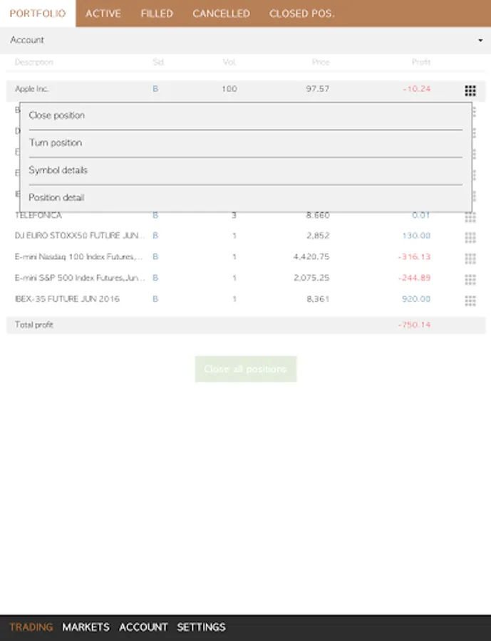 The trading is synchronized with the rest of our platforms. You can open a position at the market, for example, from Visual Chart Professional or Visual Chart Web and close it from Visual Chart App.