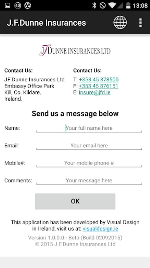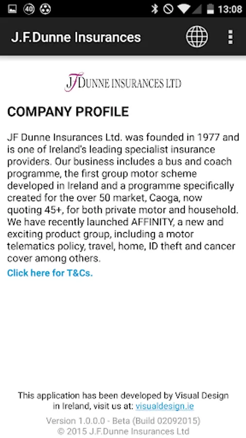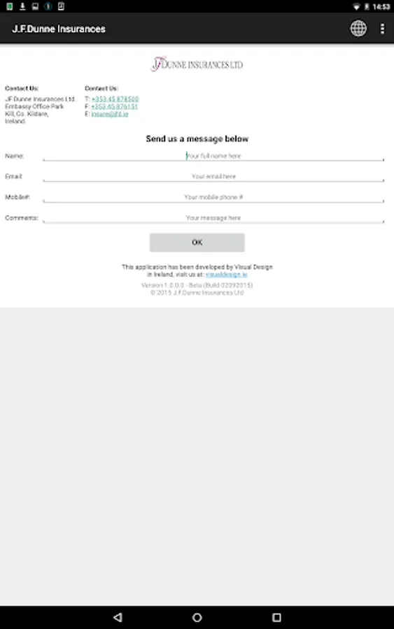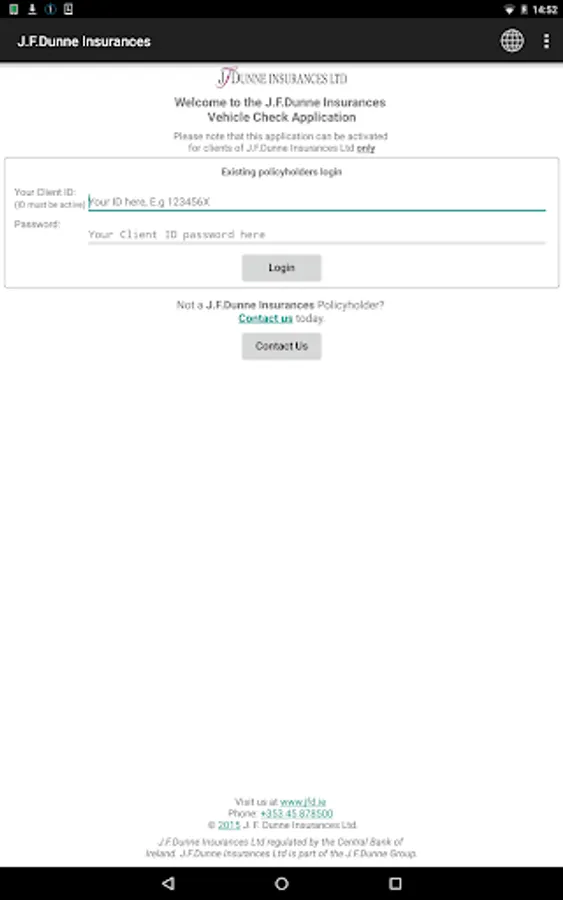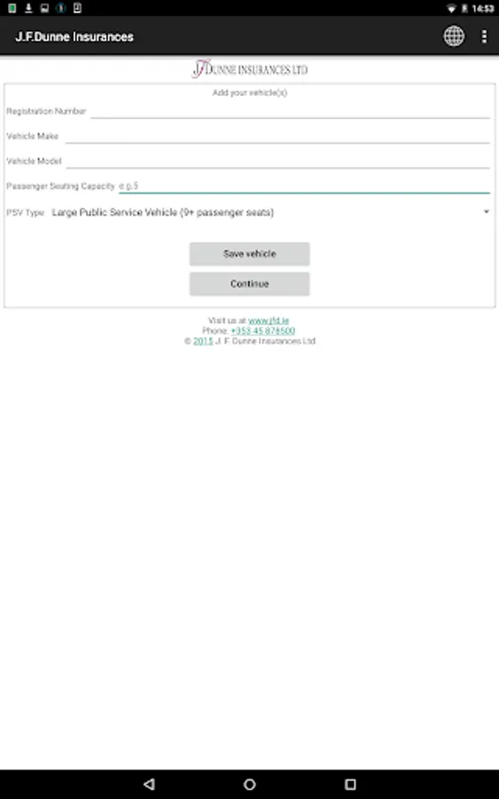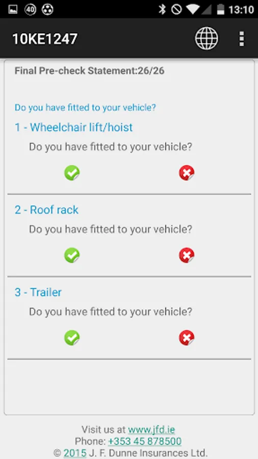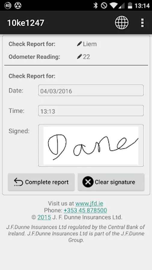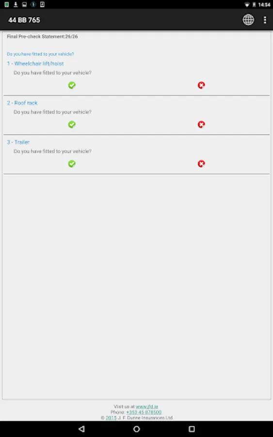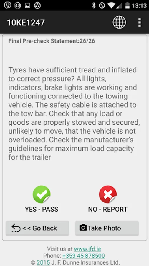 The J.F.Dunne Insurances Ltd mobile application is designed to provide you with a mobile product that allows you to record your daily inspection of the condition of your vehicle(s) in accordance with the guidelines issued by the Health & Safety Authority, Road Safety Authority and An Garda Siochana under their Vehicle Safety Checks.