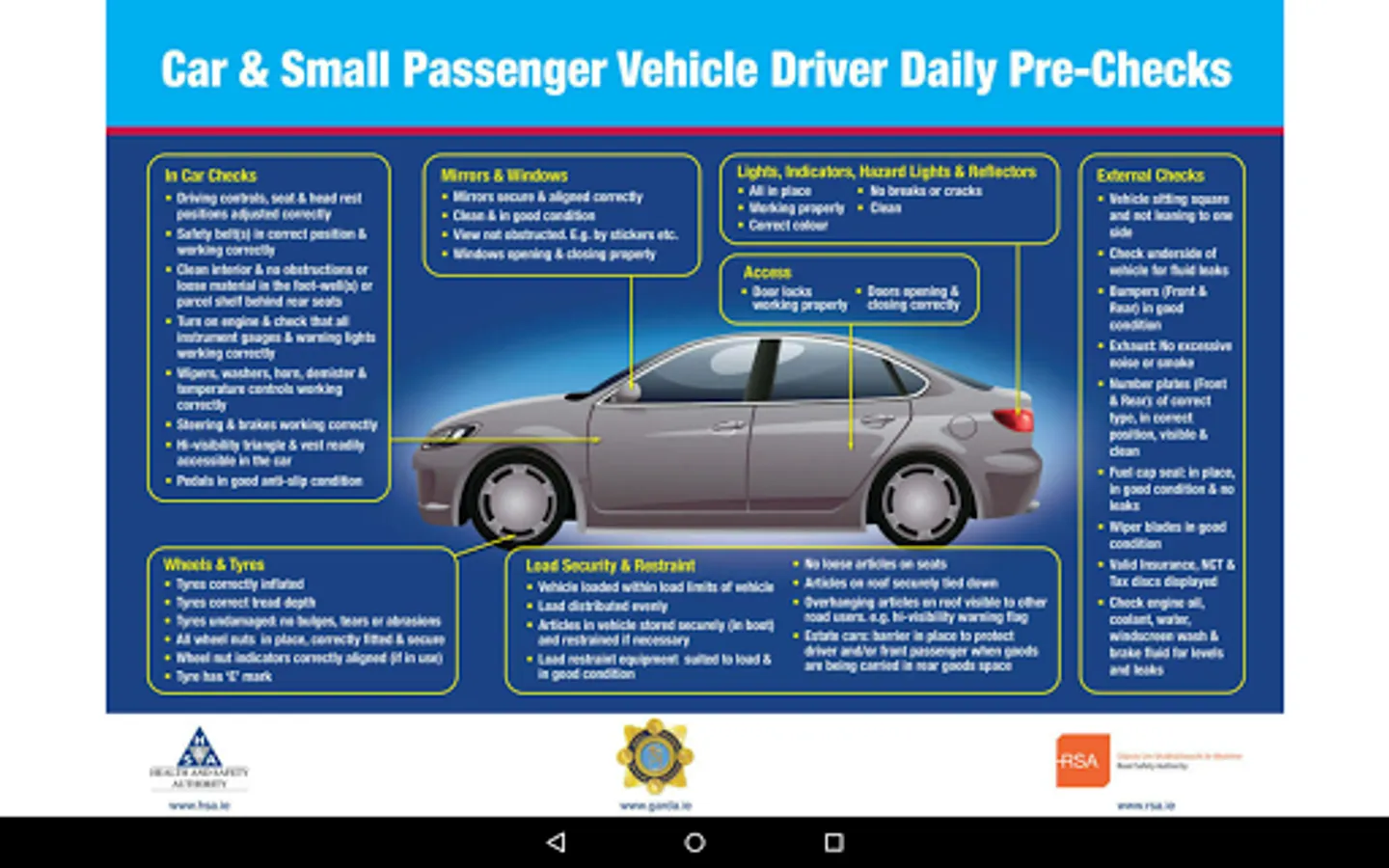 The Application uses the questions suggested by the HSA, RSA and an Garda Siochana in a format that allows you to take photos of potential issues, make notes of items that might need to be checked later and once you have progressed through all of the questions and signed it off, it is all emailed back to your office/home pc. Archive these emails then for a comprehensive record of checks made on all of your operational vehicles. In order to maintain the validity of the documentation and records, all information should be entered correctly and accurately.