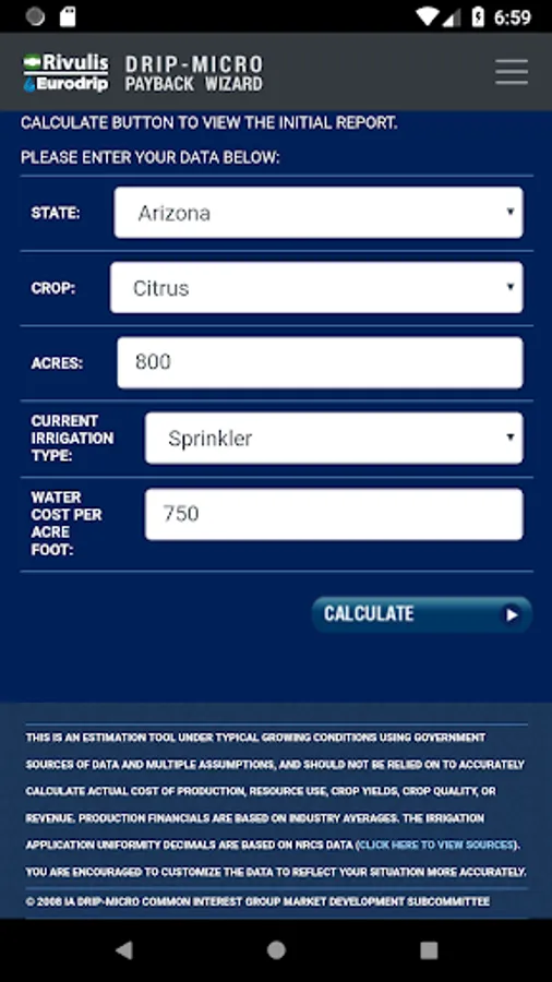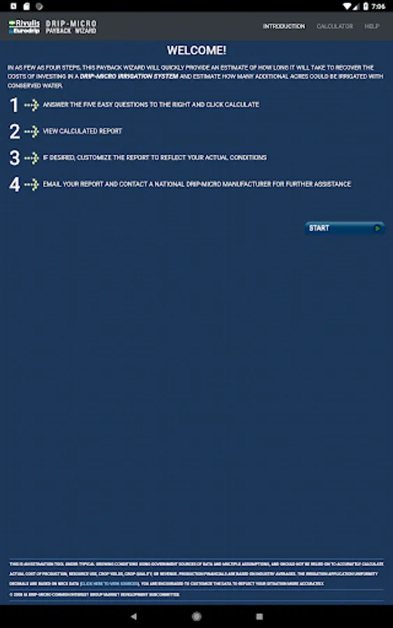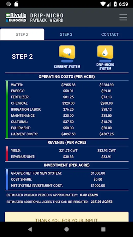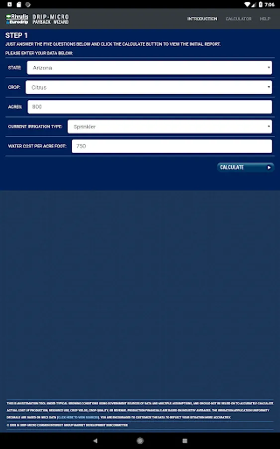 In as few as four steps, this payback wizard will quickly provide an estimate of how long it will take to recover the costs of investing in a drip-micro irrigation system and estimate how many additional acres could be irrigated with conserved water.